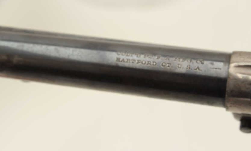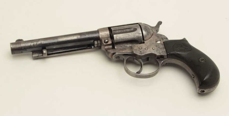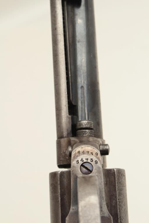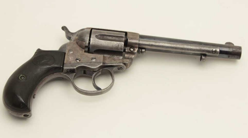 Colt Model 1877 Thunderer revolver, .41 caliber, serial #64759. The pistol is in good overall condition with a 5” barrel. The barrel retains approximately 50-60% of its blued finish with light surface rust anderosion noted. The etched panel on the barrel is still faintly visible and the front sight is full height. The frame and cylinder have gone to a silver/grey patina with some flashes of old, muted case colorpresent and light pin prick pitting in areas. The back of the hammer retains some bright niter blue finish. The action is working at the time of description. The checkered hard rubber grips fit well and are in goodcondition with wear and use but no chips. The bore is good, the action functions and the markings are sharp. (Antique) Est.: $600-$1,200.