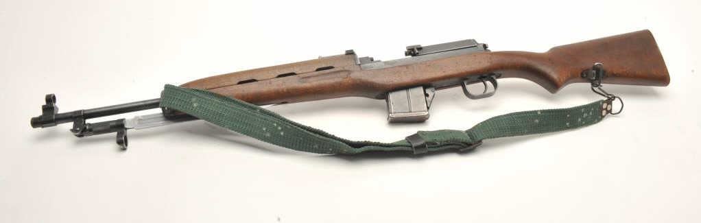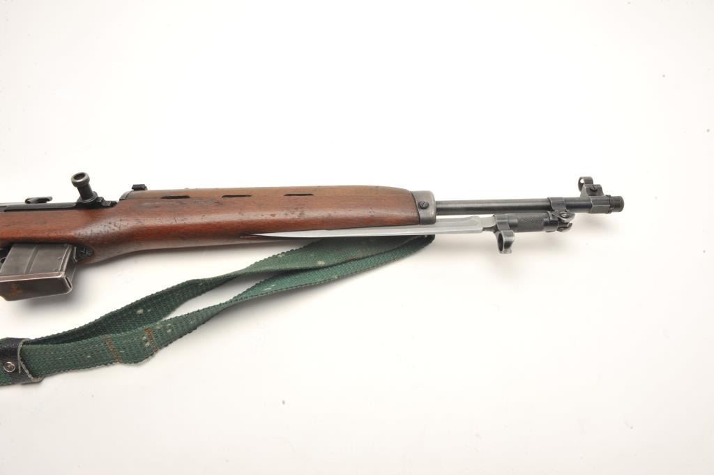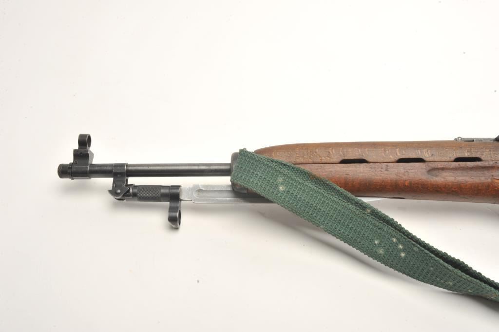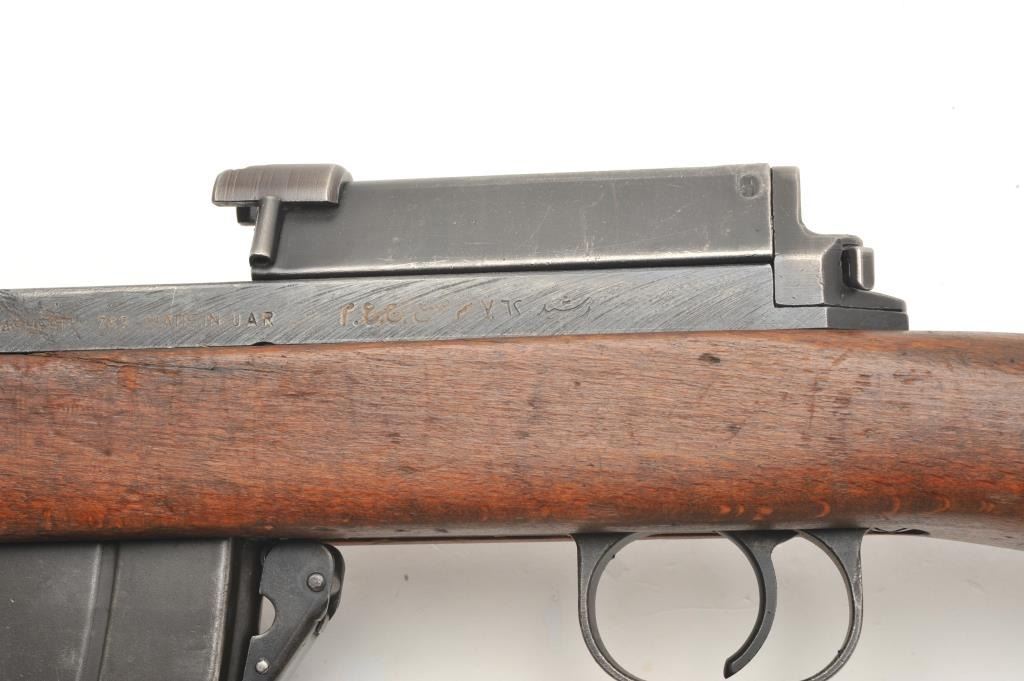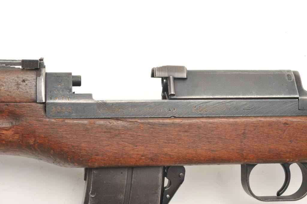 Egyptian Rasheed semi-auto carbine, 7.62 x 39 caliber, serial #3022. The carbine is in good overall condition with a 20” barrel with hooded front and military tangent rear sights. The barrel and receiver retain asignificant amount of their military finish. Built by Hakim, the Rasheed combines the design of the Swedish AG42B Ljungman with the more modern SKS carbines. The smooth wood stock is in good condition showing moderateuse with mars and dents. The carbine includes a proprietary folding bayonet. The bore is poor with heavy pitting noted, the action crisp and markings are sharp. The Rasheed were limited in production, with some estimates as low as 8,000 and are rarely encountered. The lot includes one correct magazine and a canvas sling. (Modern) Est.: $400-$800.