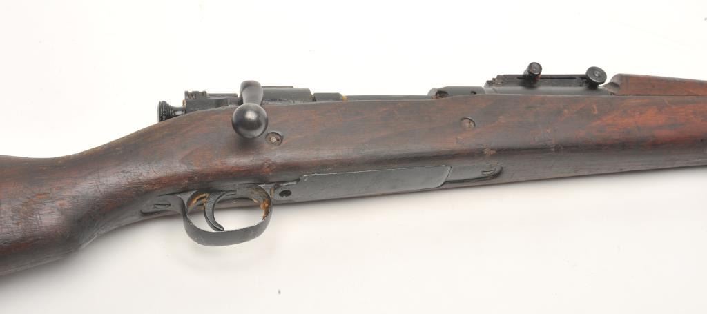 Springfield U.S. Model 1903 bolt action rifle, .30 caliber, serial #1070927. The rifle is in good overall condition with a 24” barrel with a blade front and military tangent style rear sights. The barrel andreceiver retain the majority of their military finish with wear at the muzzle and a significant amount of old packing grease evident. The “HS” marked barrel is dated 8-44 with the flaming bomb emblem. Thesmooth wood stock is dark with mars, compressions and old packing grease. There are several faint cartouches on the underside of the butt stock behind the trigger guard. The stock includes sling swivels, has anon-matching serial number and ends with a smooth metal butt plate with trap. The bore is fair, the action is crisp and markings are sharp. The lot includes the CMP certificate of authenticity provided at purchase.(C+R) Est.: $300-$600.