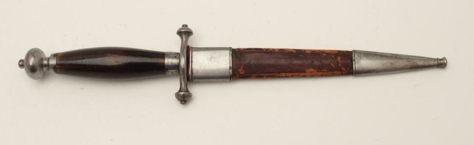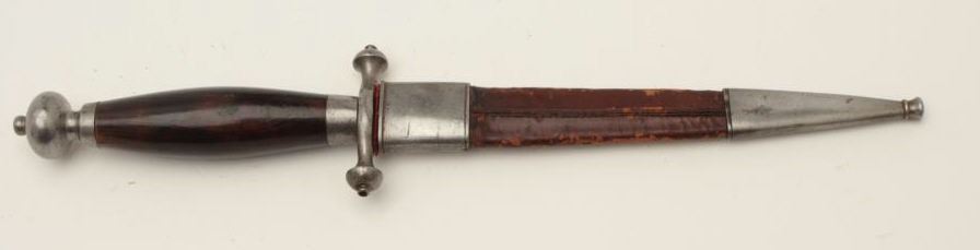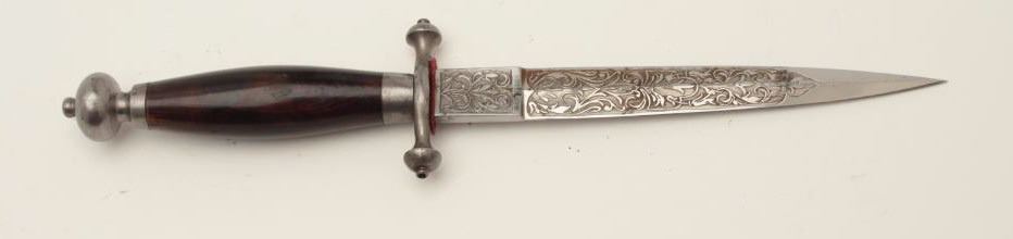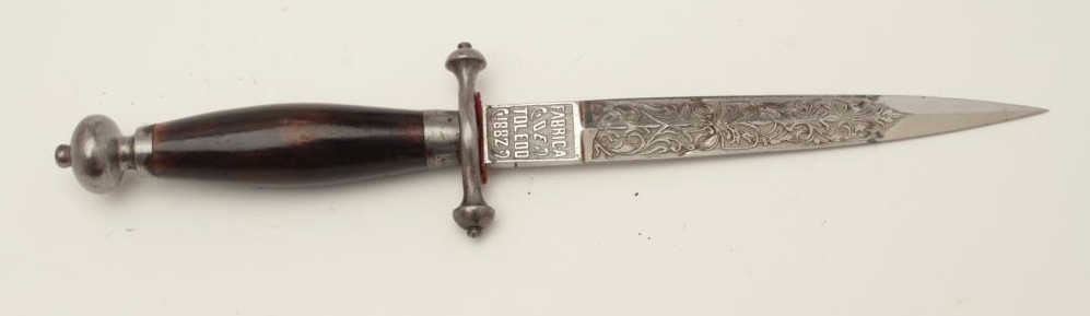 Dagger with fancy etched blade marked “Fabrica De Toledo 1882”. Measures 11 ¾” overall with a 7 ¼” blade. In near fine condition with scabbard. Etching is exceptional quality and deep. Est.: $350-$700