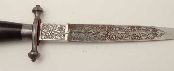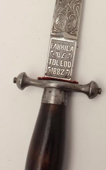 Lot 348 Dagger with fancy etched blade marked “Fabrica De Toledo 1882”. Measures 11 ¾” overall with a 7 ¼”