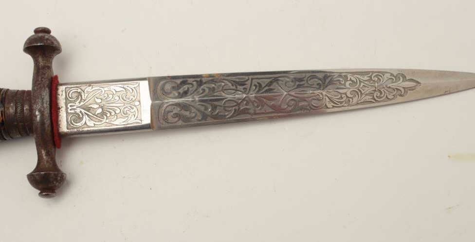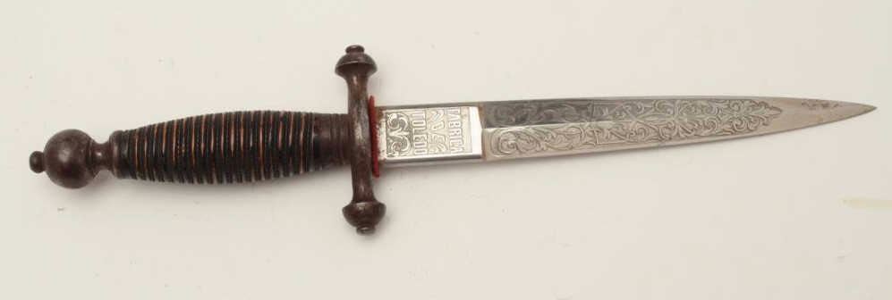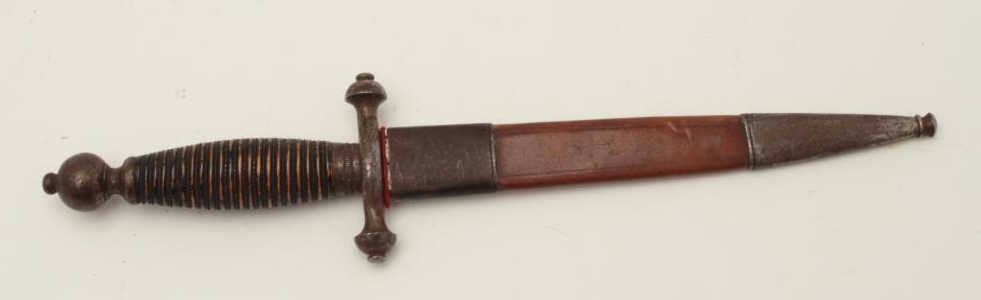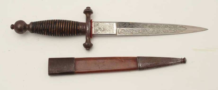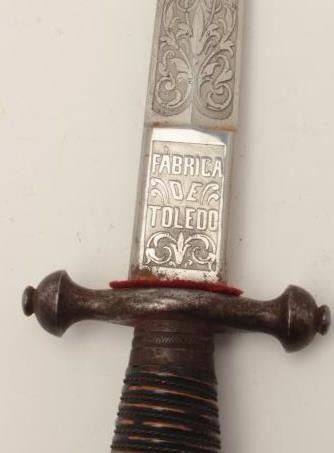 Spanish made dagger marked “Fabrica De Toledo”. Measures 10 ½” overall with a 6 ½” spearpoint blade reinforced construction for piercing. Very good condition overall with near fine blade. 19th to early 20th century.Original scabbard. Made in an earlier style. Est.: $350-$700