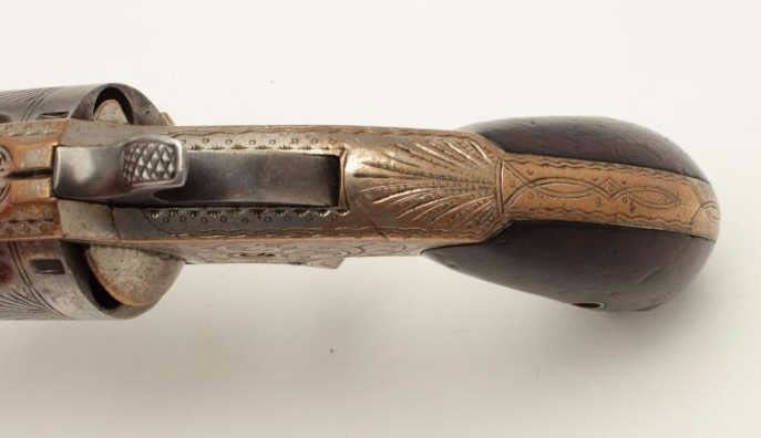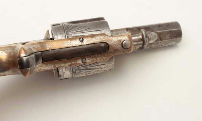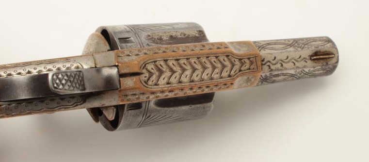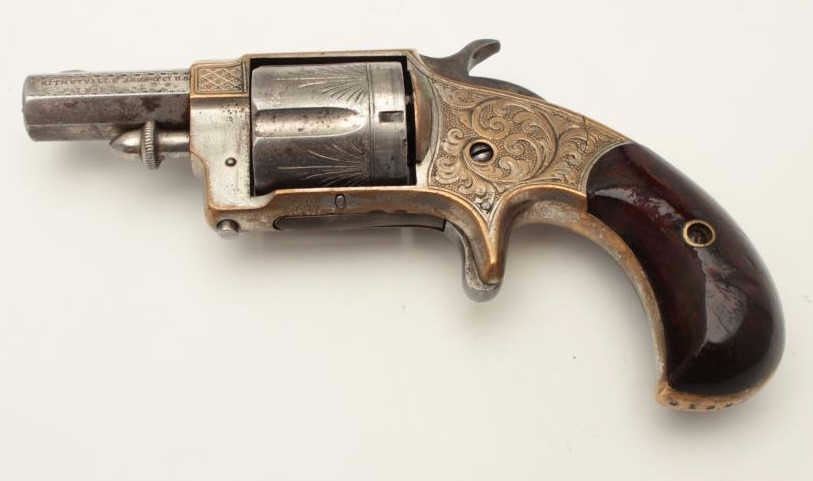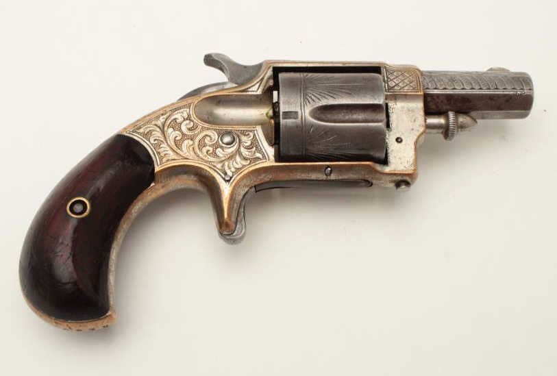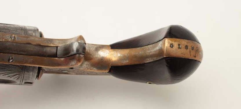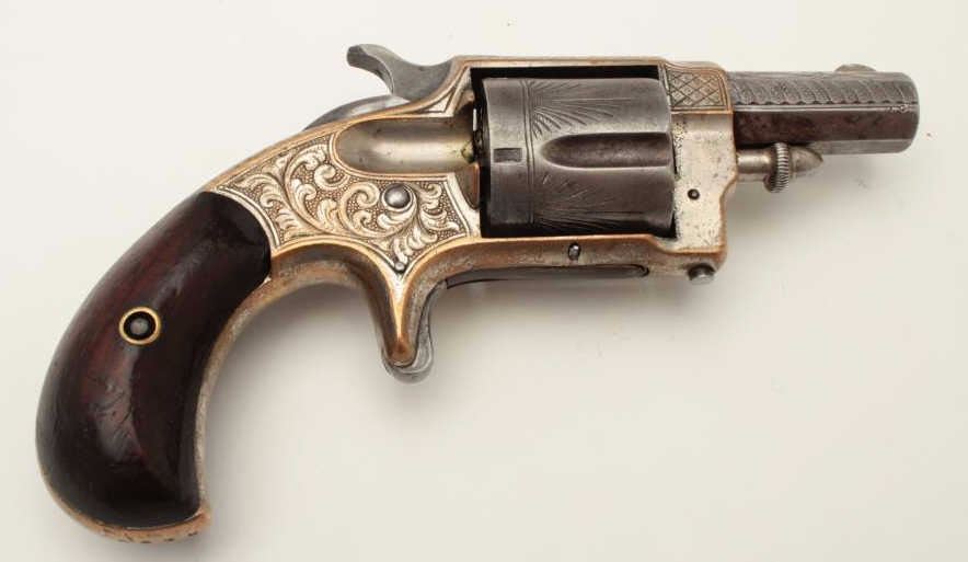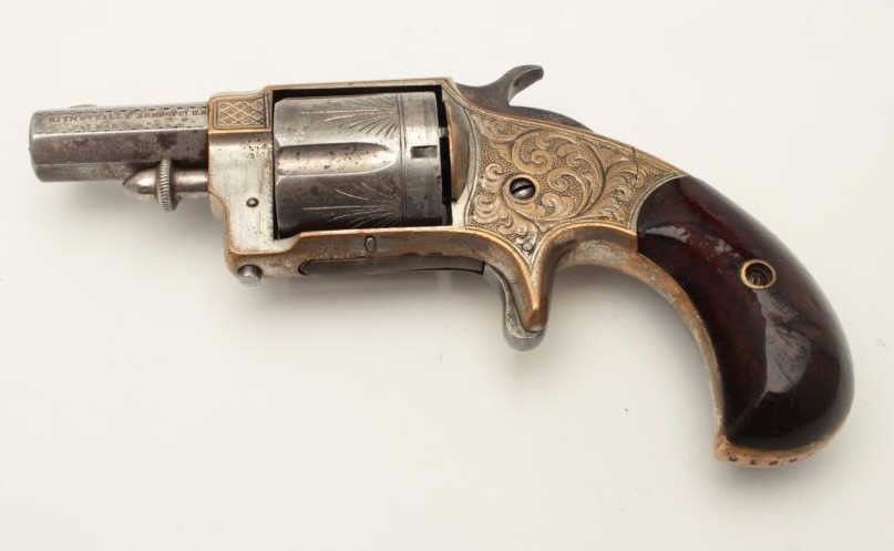 Whitneyville .38 caliber spur trigger revolver, desirable 2” octagon barrel, deluxe and fully N.Y. engraved, nickel finish, rosewood grips with left grip showing several old mars, S/N 51891, in overall very goodcondition. (Antique). From the Whitney family collection. Est.: $400-$800.