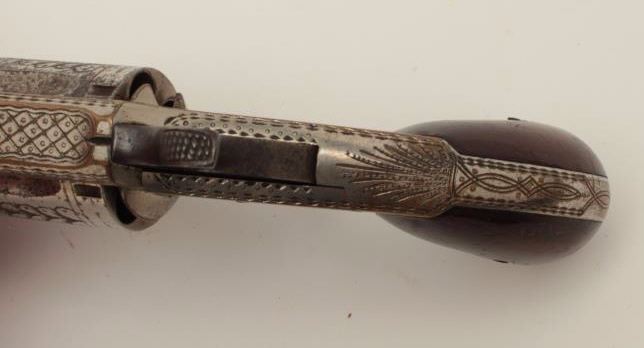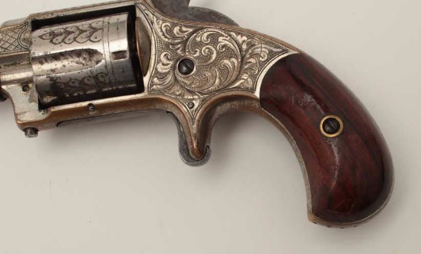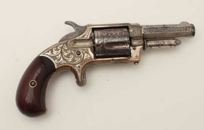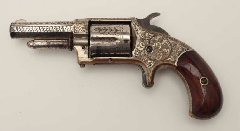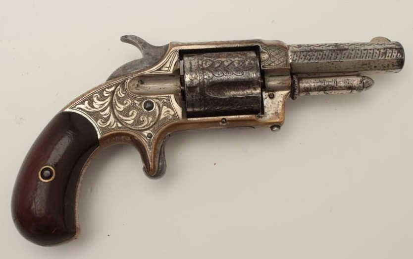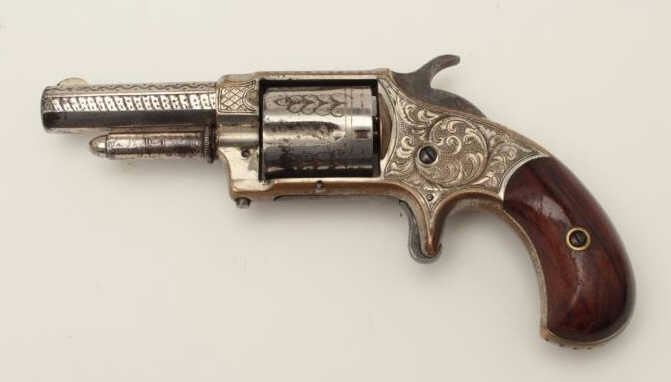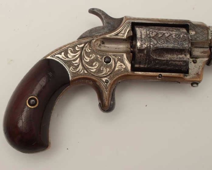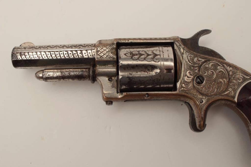 Whitneyville .32 caliber spur trigger revolver, 2.5” octagon barrel, nickel finish, deluxe engraving, rosewood grips, S/N 7663B, in overall very good condition. (Antique). From the Whitney familycollection. Est.: $400-$800.