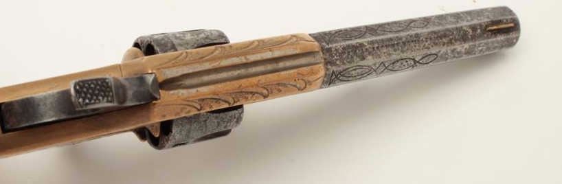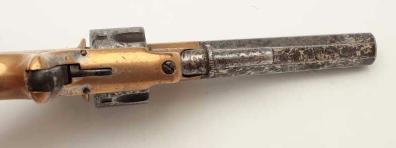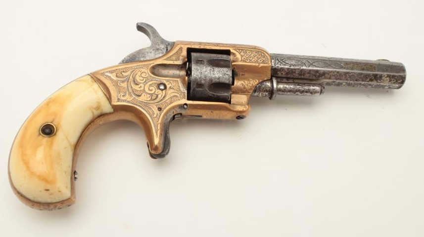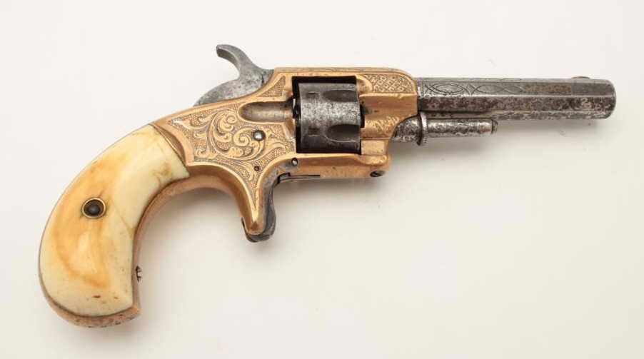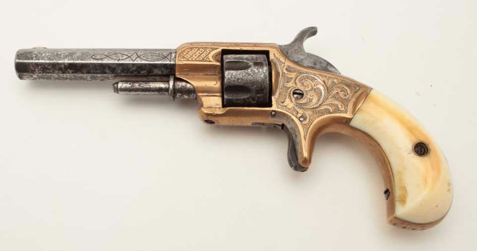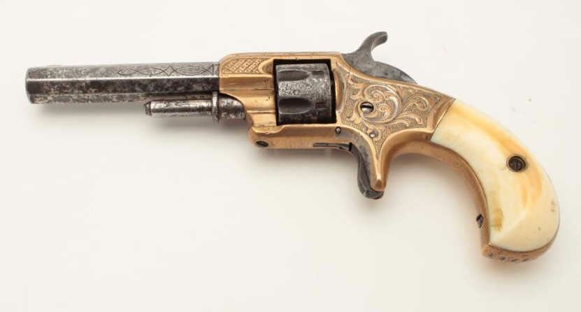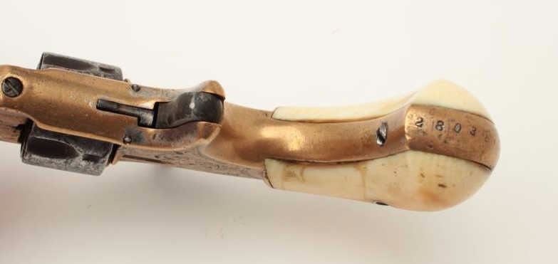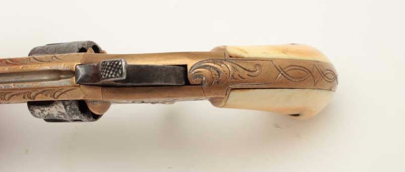 Lot 355 Whitneyville .22 caliber spur trigger revolver, brass frame, engraved, 3.25” octagon barrel, ivory