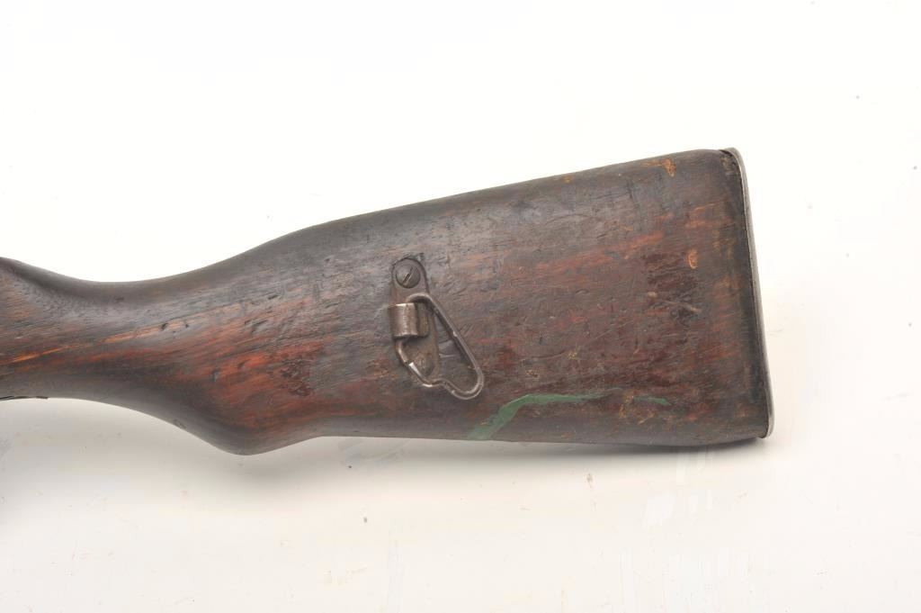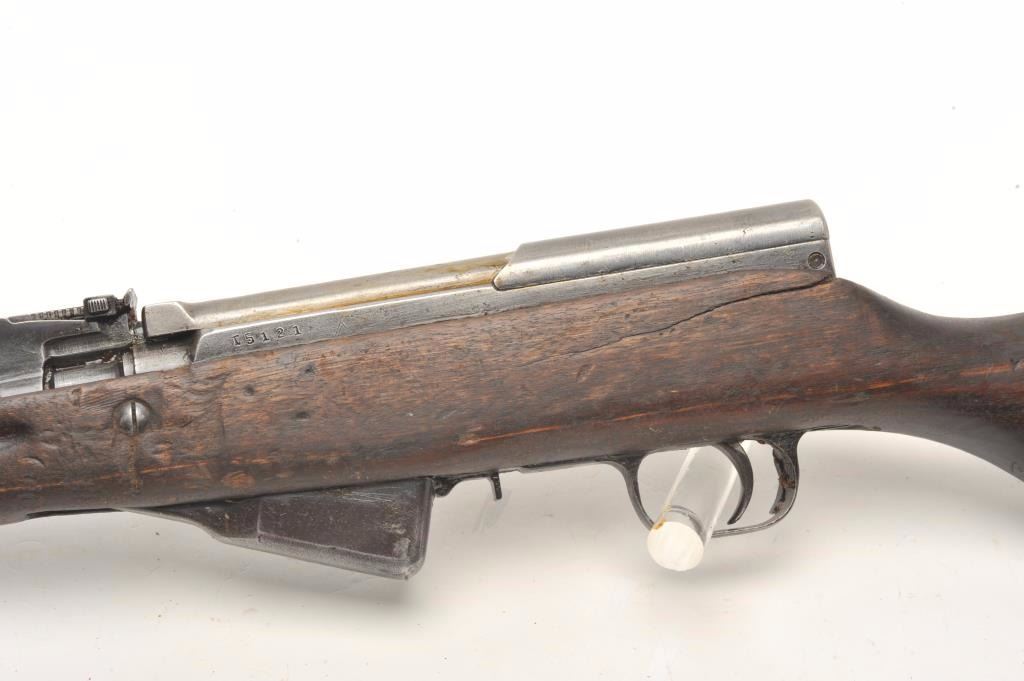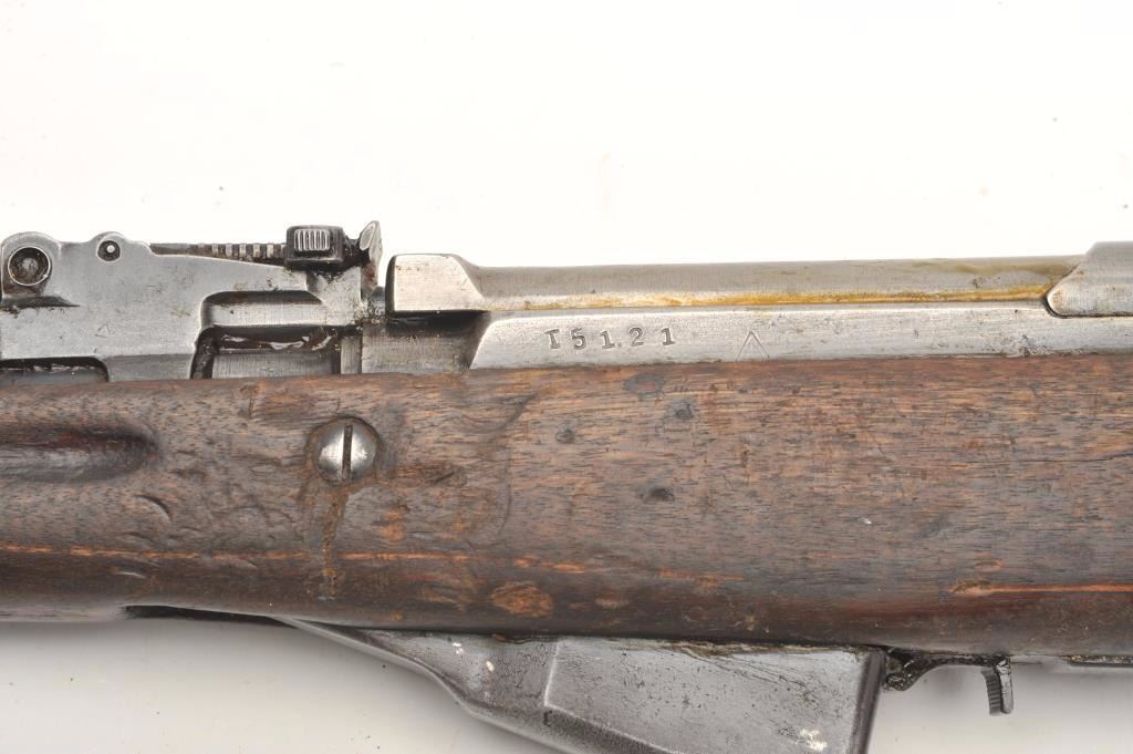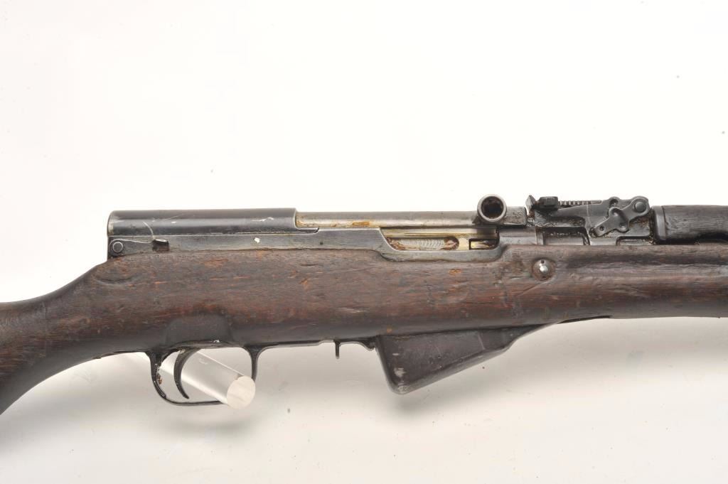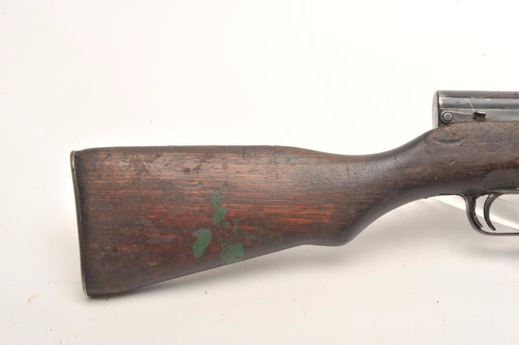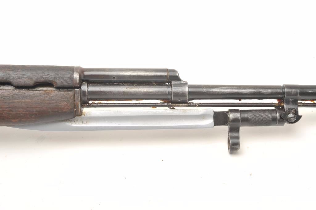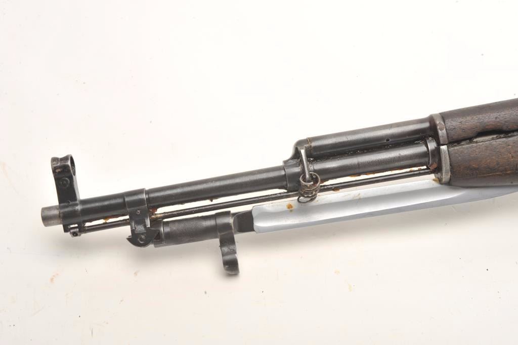 Russian SKS semi-automatic rifle, 7.62 x 39 caliber, 18.5” barrel, military finish, wood stock, folding bayonet, S/N 15121, in overall fair to good condition; heavily loaded with grease for storage, good action, stock showswear and scattered old mars, dings and scratches from carry and storage. (Modern). Est.: $400-$800.