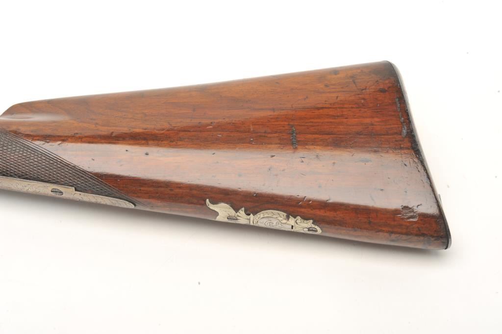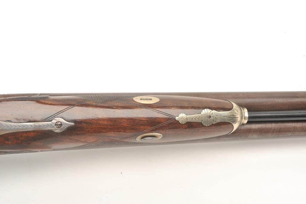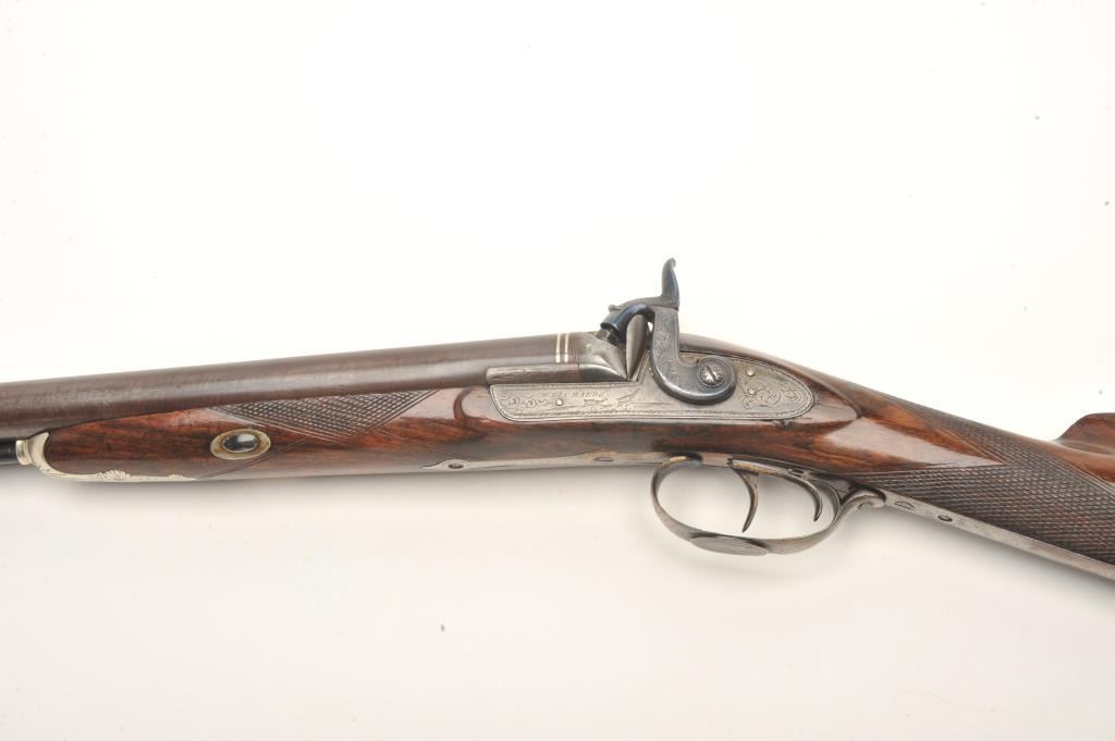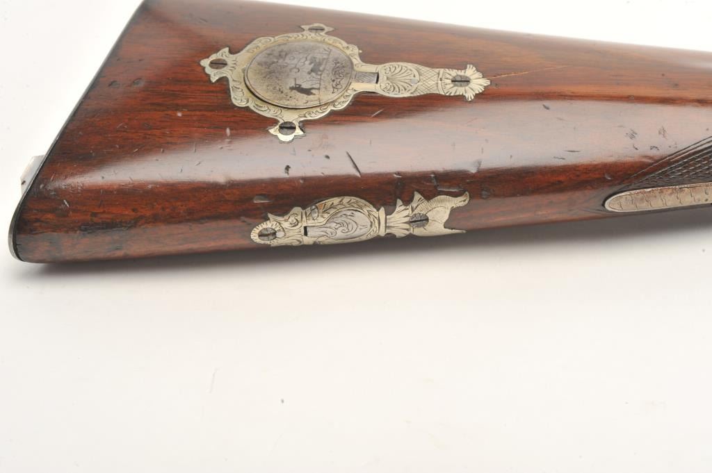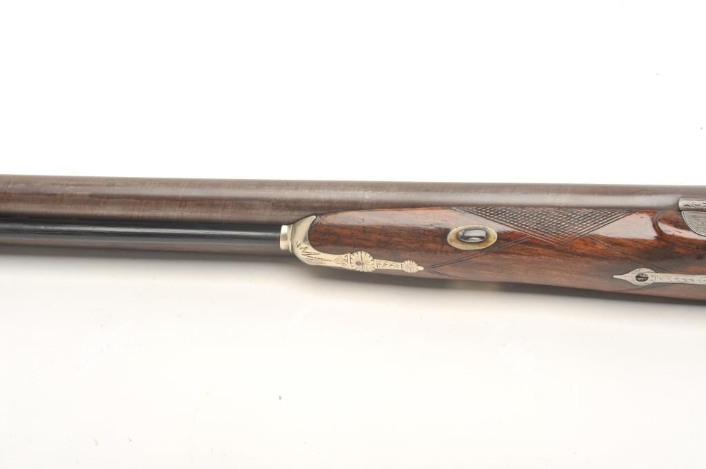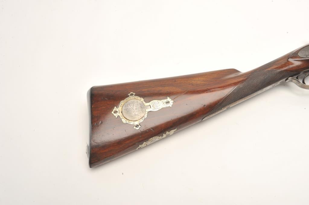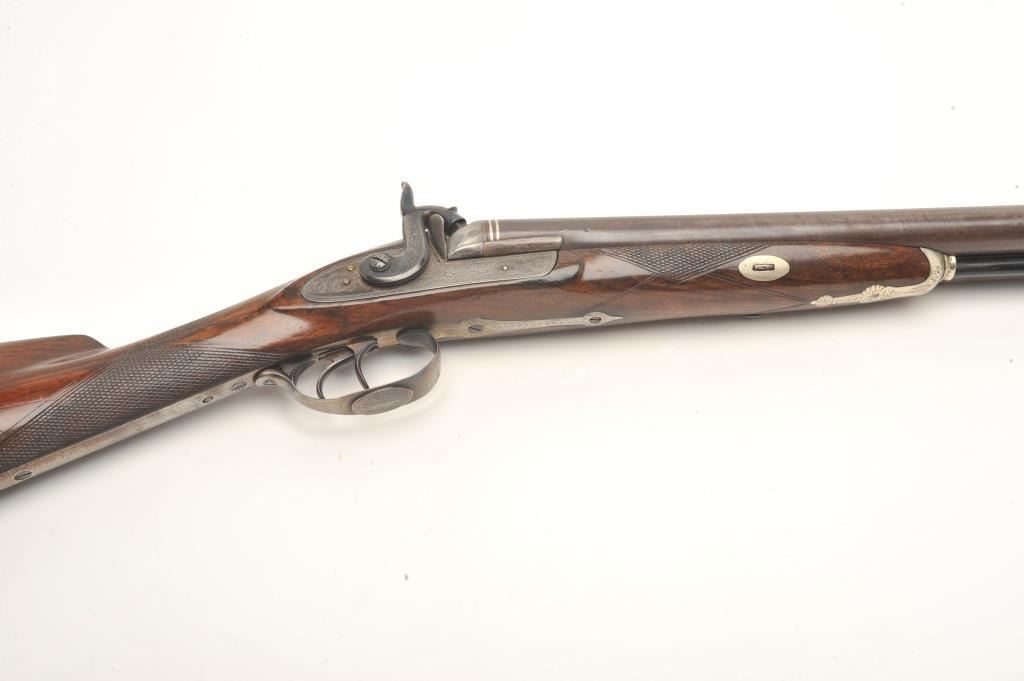 “W. Richards London” signed percussion SxS shotgun in 12 GA smoothbore with thick barrels and raised central rib to accept slugs or balls. Silver inlaid scrolls and arrows around the front sight and silverinlaid “London” at the breech. Also shows game scene with scrolling on locks and double silver bands. Fancy engraved silver and German silver mountings. European restoration and in very good condition overall. Tightaction and shootable. Measures 47” overall with 30” barrels. (Antique) Est.: $1250-$2500
