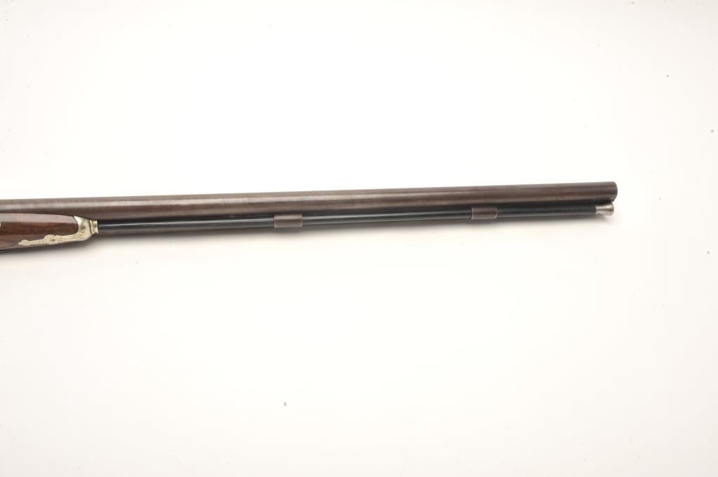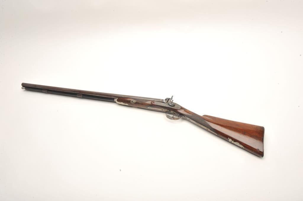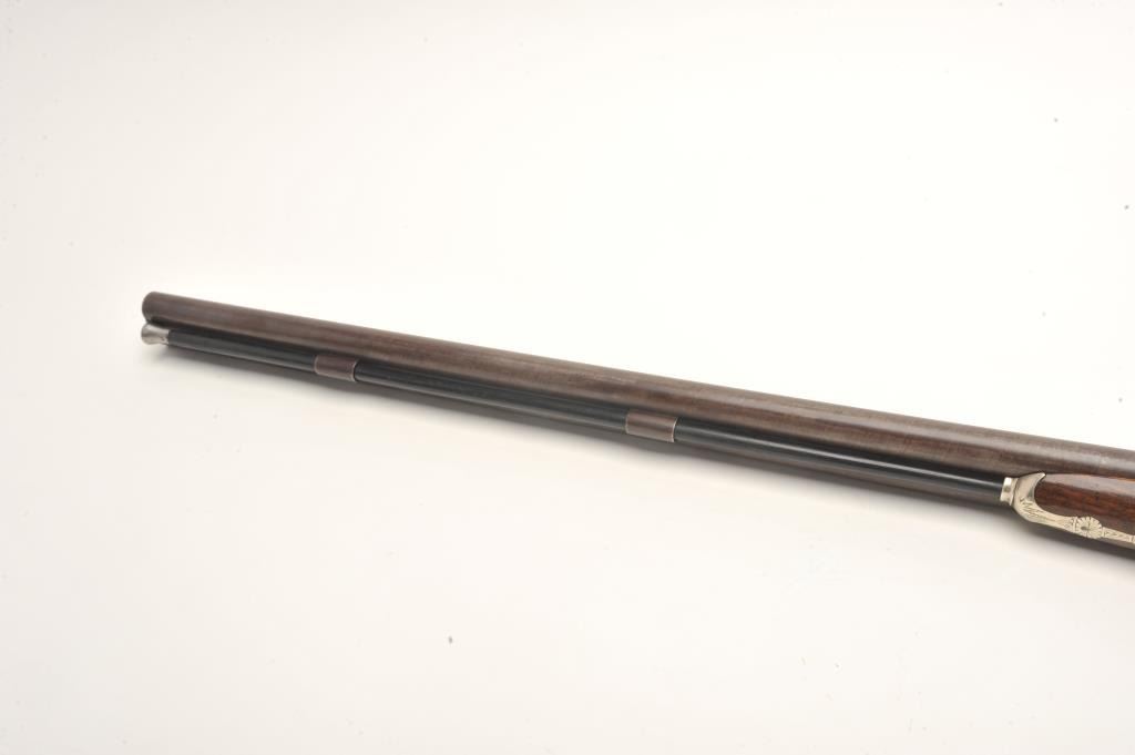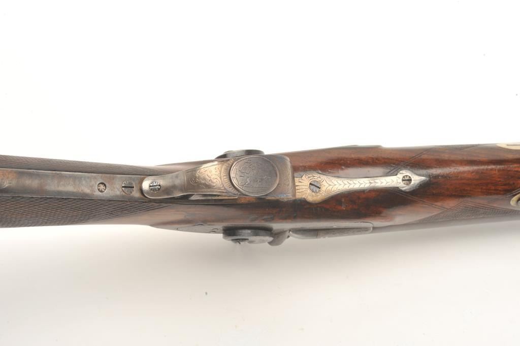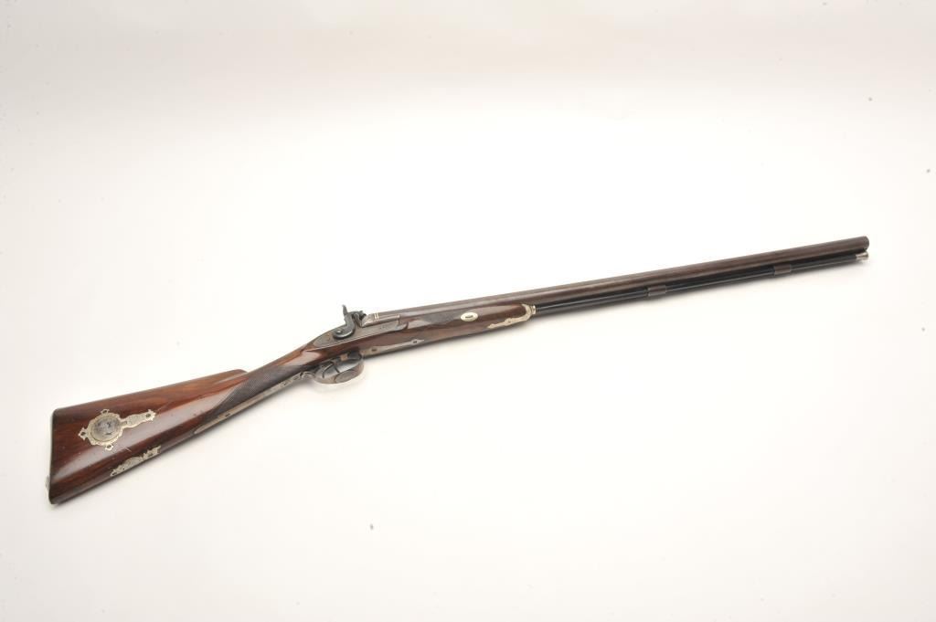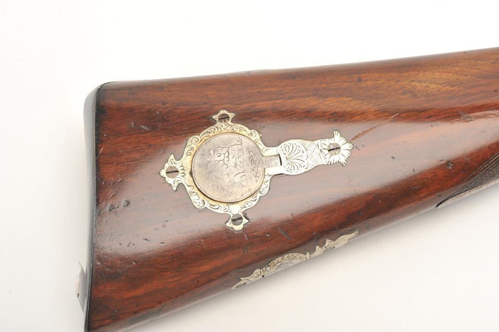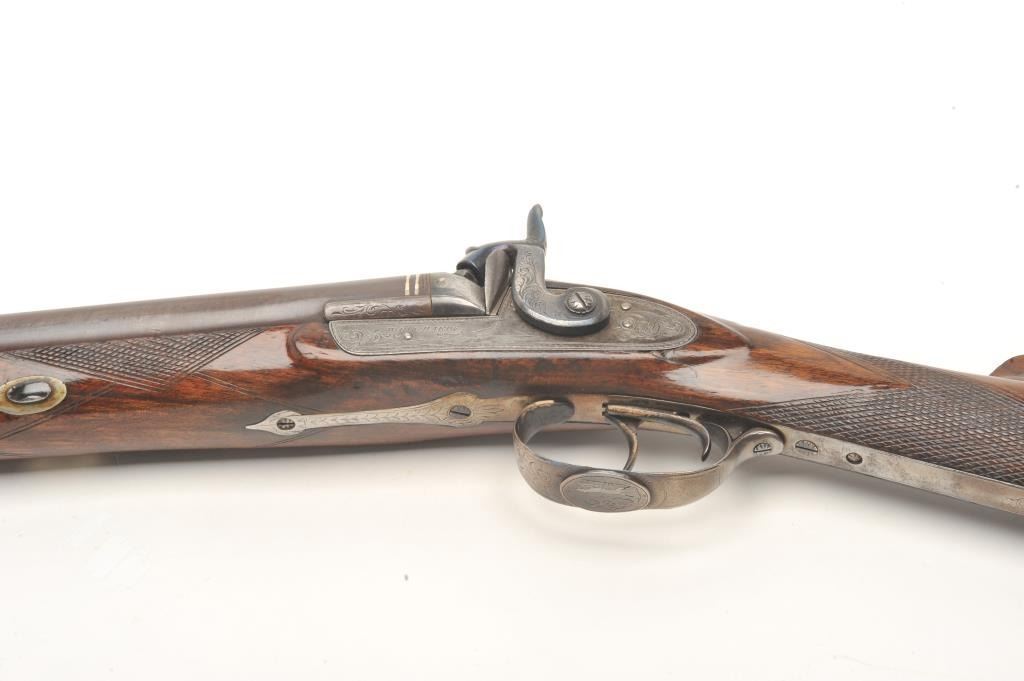 “W. Richards London” signed percussion SxS shotgun in 12 GA smoothbore with thick barrels and raised central rib to accept slugs or balls. Silver inlaid scrolls and arrows around the front sight and silverinlaid “London” at the breech. Also shows game scene with scrolling on locks and double silver bands. Fancy engraved silver and German silver mountings. European restoration and in very good condition overall. Tightaction and shootable. Measures 47” overall with 30” barrels. (Antique) Est.: $1250-$2500