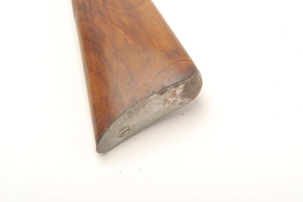 Cavalry style late percussion carbine probably French with radical flared muzzle. Measures 36 ½” overall with a 21 ½” barrel of almost 1” smoothbore. The metal has been cleaned with some light to moderate scattered pitting. The stocks are also cleaned and refreshed. Good to very good overall. Circa 1860’s. (Antique) Est.: $350-$700