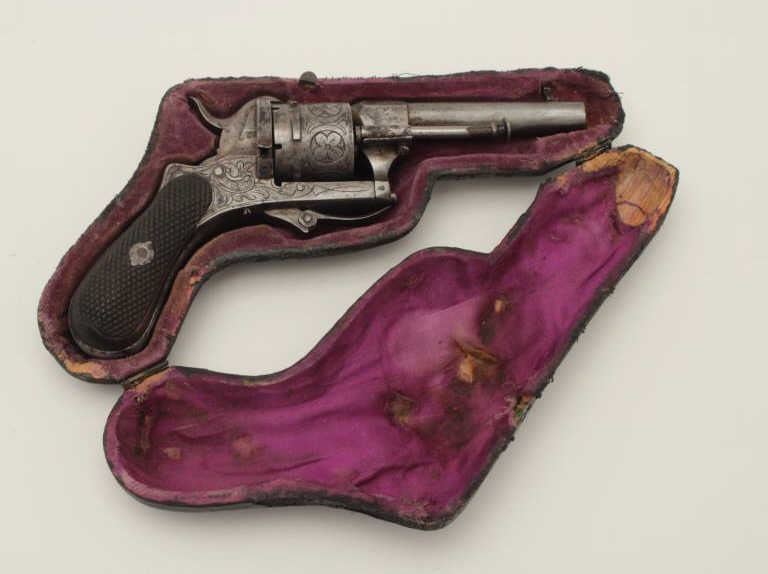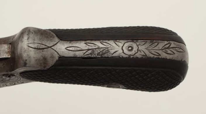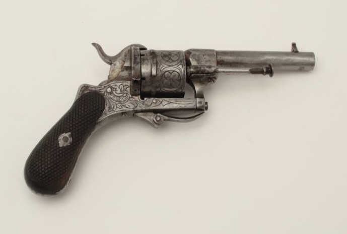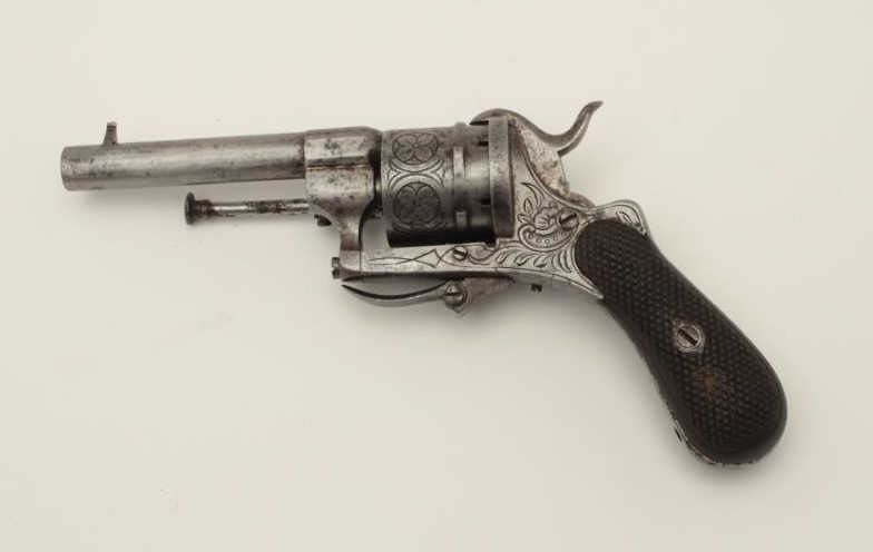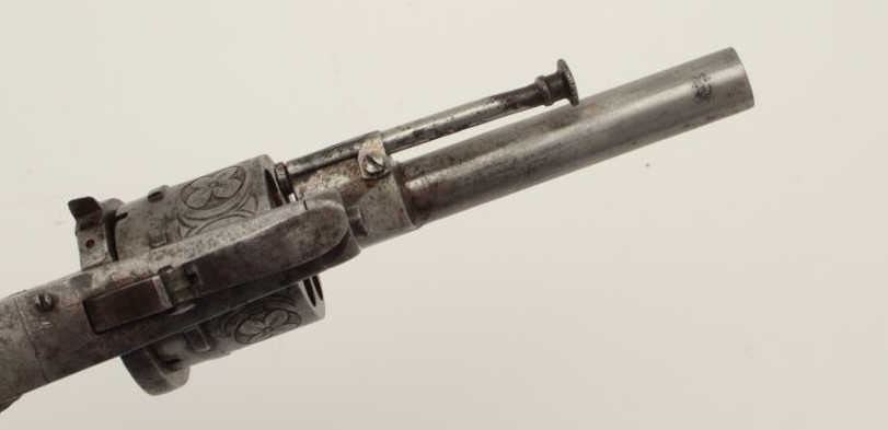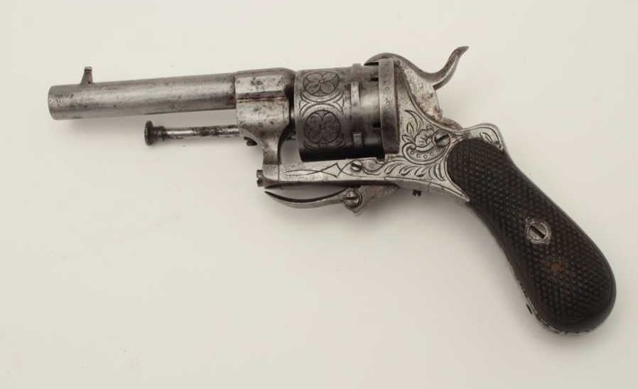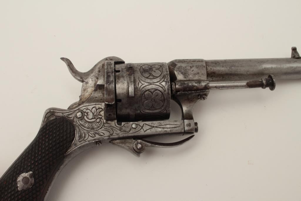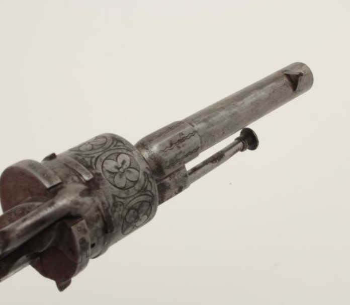 Lot 370 Pipe cased pinfire revolver circa 1860s showing floral engraving and checkered wood grips. Measure