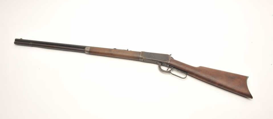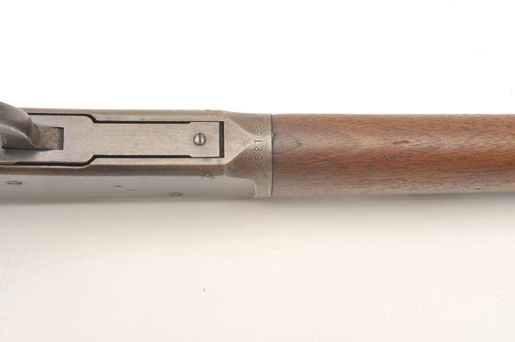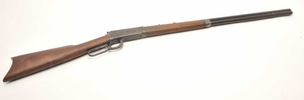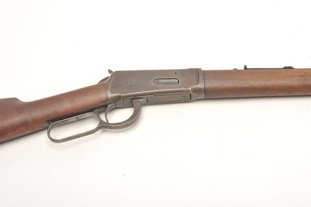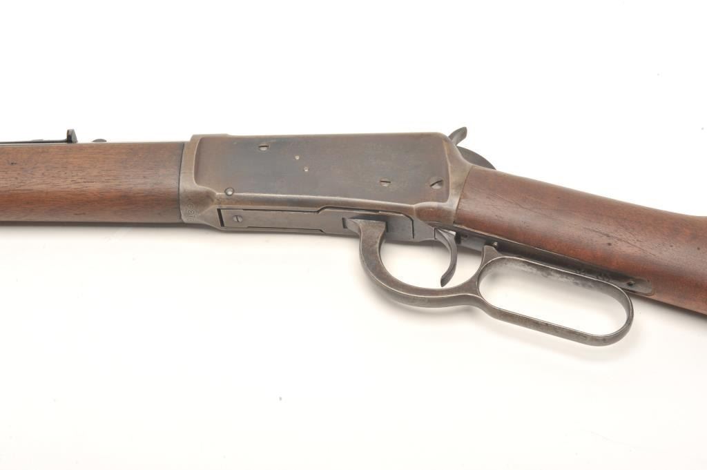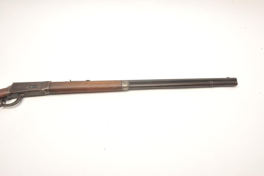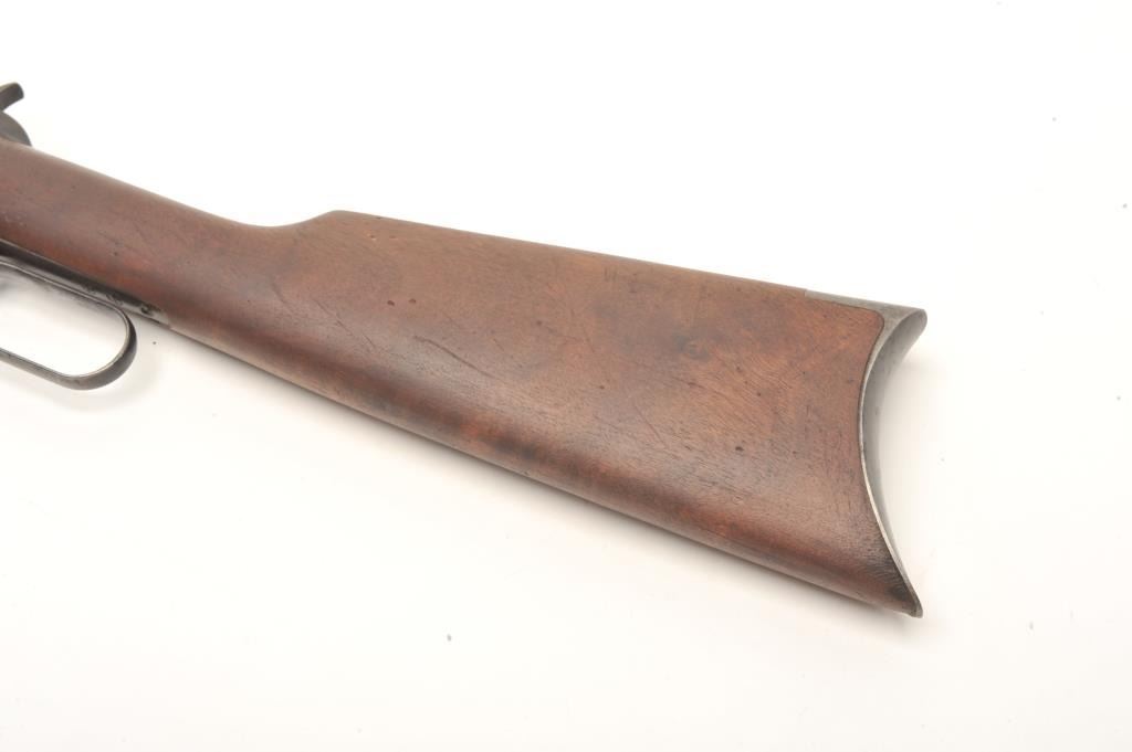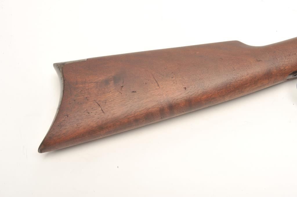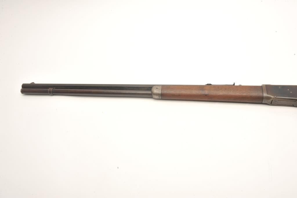 Winchester Model 1894 lever action rifle, .30 WCF caliber, serial #99139. The rifle is in good overall condition with a 26” octagon barrel. The barrel and magazine tube retain a significant amount of their muted bluefinish with high point edge wear, some old, dried oil and light surface erosion present. The knife blade front sight is marked Marble and Sheard, which is unusual. The receiver has gone to a pleasing plum patina with muted blue in the protected areas. The smooth wood stocks are in good condition showing moderate wear with small mars and compressions. The butt stock ends with a crescent steel butt plate. The bore is fairand may clean, the action is crisp and the markings are sharp on this desirable, antique Winchester. (Antique) Est.: $700-$1,400.