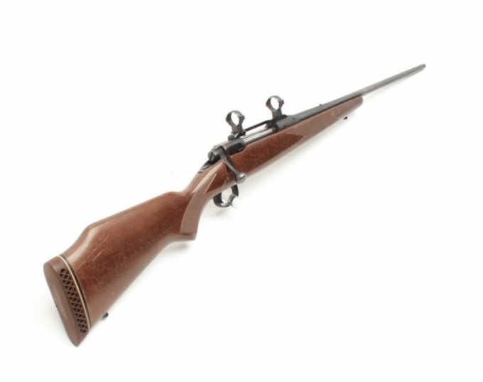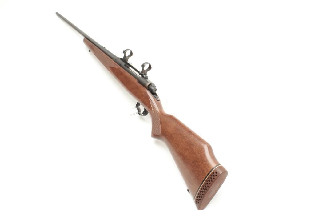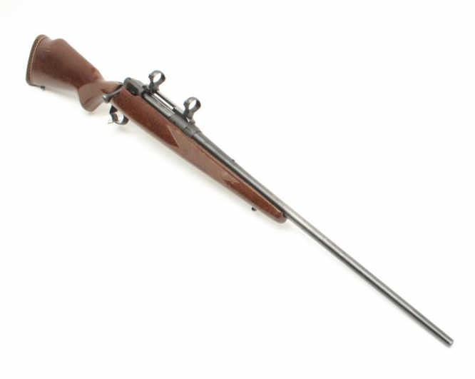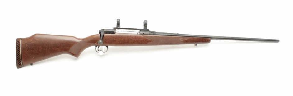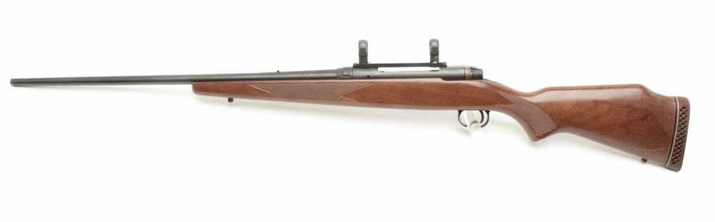 Savage Model 110 bolt action rifle, 7mm Rem. Mag. caliber, serial #F082839. The rifle is good overall condition with a 24” barrel which retains the majority of its blued finish with light muzzle wear and the frontand rear sights removed. The receiver shows a significant amount of its muted blue finish with a blind magazine. The checkered wood stock is in good condition showing moderate wear and mars consistent with use. The buttstock ends with a ventilated rubber White Line pad. The bore is good, the action functions and markings are sharp. The receiver is topped a one-piece Redfield scope mount with rings. (Modern) Est.:$300-$600.