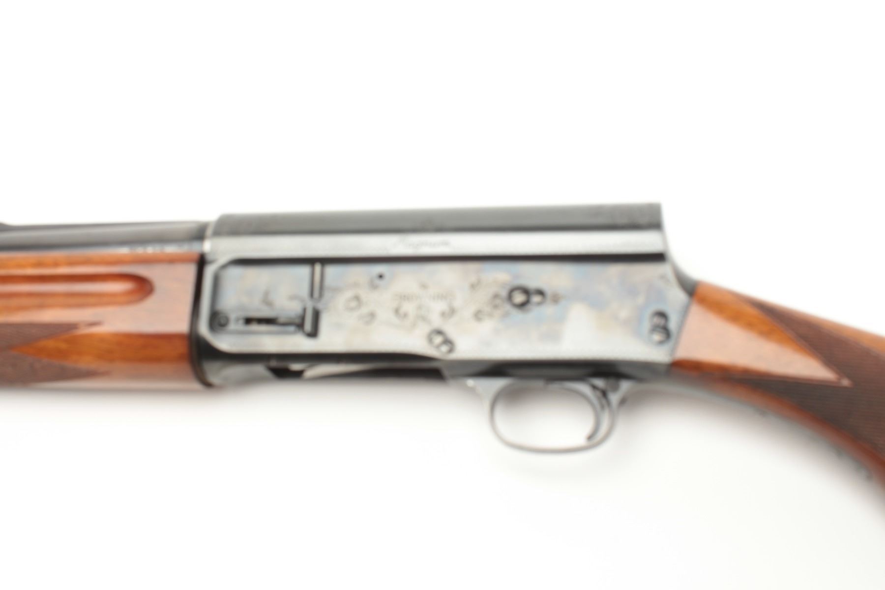 Browning Auto 5 Magnum semi-auto shotgun, 12 gauge, serial #6V79151. The shotgun is in very good overall condition with a 30” barrel with a full-length ventilated rib and steel bead front sight. The barrel retains nearlyall of its blued finish and is marked for 3” magnum shells. The receiver is tastefully scroll engraved and shows the majority of its thinning blued finish. The finely checkered wood stock is in very good condition withsmall mars and compressions consistent with field use. The butt stock features a round knob pistol grip and ends with a Browning marked ventilated rubber pad providing a 14” LOP. The bore is good, the action crisp andmarkings are sharp on this lightly used Auto 5 Magnum. (C+R) Est.: $400-$800.