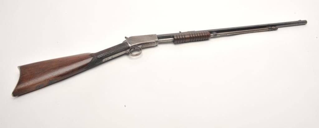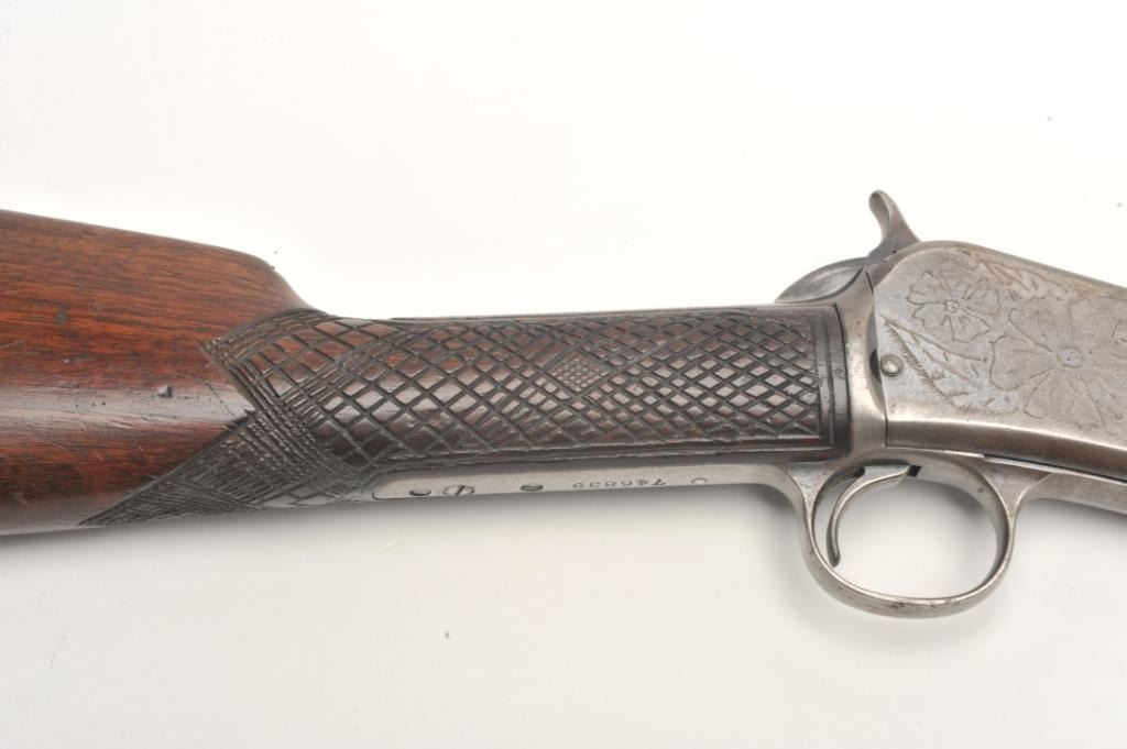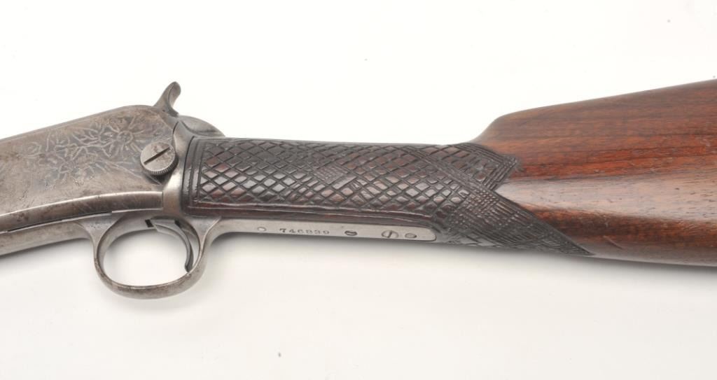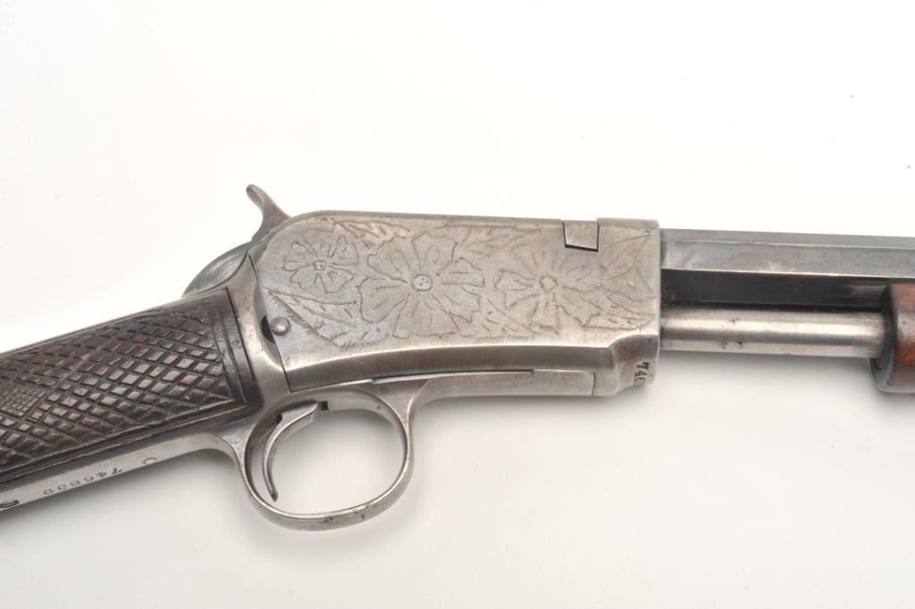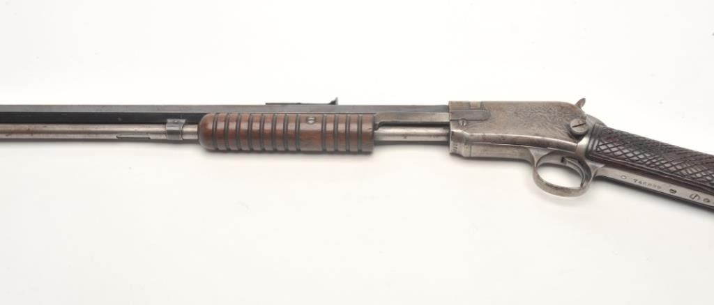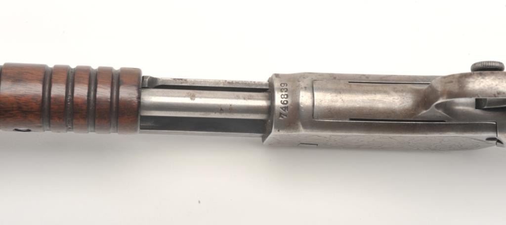 Winchester Model 90 takedown pump rifle, .22 Long Rifle caliber, serial #746839. The rifle is in good overall condition with a 24” octagon barrel. The barrel retains approximately 70-80% of its thinning bluedfinish with sharp edges, while the ¾ magazine has gone to a silver/grey patina. The barrel has four holes from an old side mount filled on the left, forward the front ring. The receiver shows a significant amount ofmuted blue finish with amateur engraving depicting flowers on both sides. The smooth wood stocks are in good condition with mars and sanding at the toe. The butt stock has been hand checkered at the wrist and endswith a smooth metal crescent butt plate. The bore is fair, the action crisp and markings are sharp. (C+R) Est.: $200-$400.