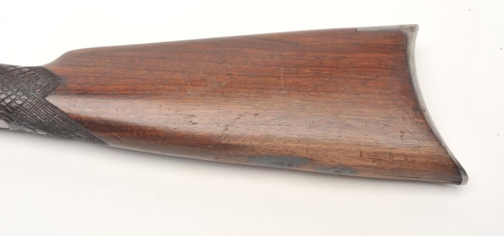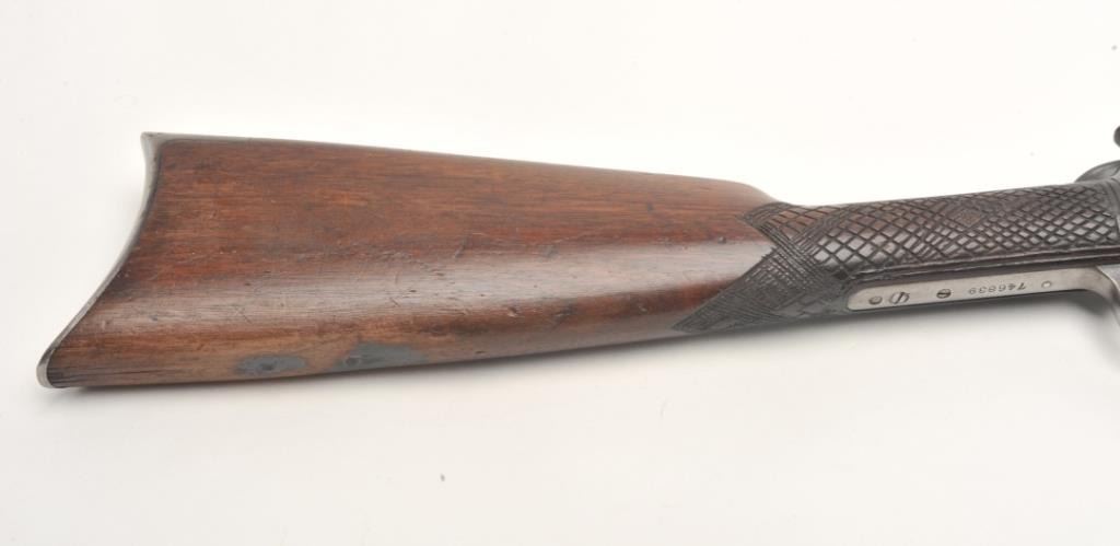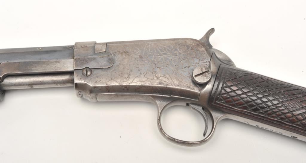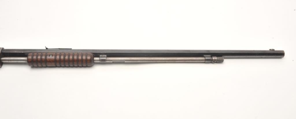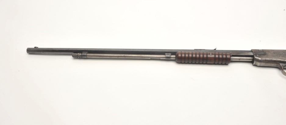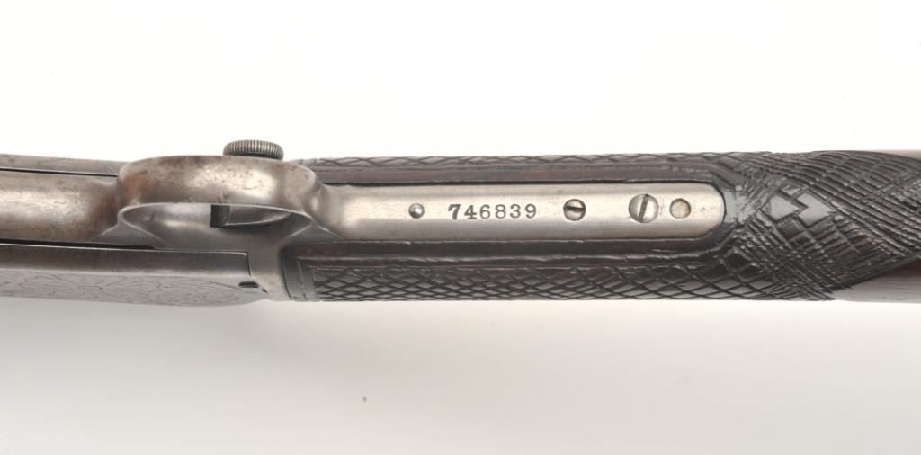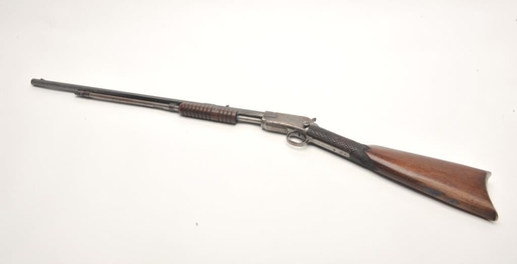 Winchester Model 90 takedown pump rifle, .22 Long Rifle caliber, serial #746839. The rifle is in good overall condition with a 24” octagon barrel. The barrel retains approximately 70-80% of its thinning bluedfinish with sharp edges, while the ¾ magazine has gone to a silver/grey patina. The barrel has four holes from an old side mount filled on the left, forward the front ring. The receiver shows a significant amount ofmuted blue finish with amateur engraving depicting flowers on both sides. The smooth wood stocks are in good condition with mars and sanding at the toe. The butt stock has been hand checkered at the wrist and endswith a smooth metal crescent butt plate. The bore is fair, the action crisp and markings are sharp. (C+R) Est.: $200-$400.