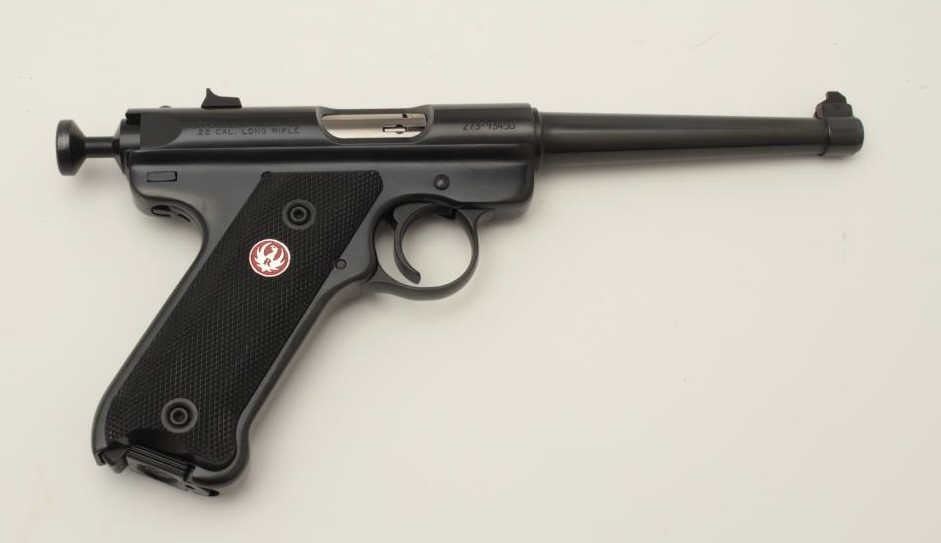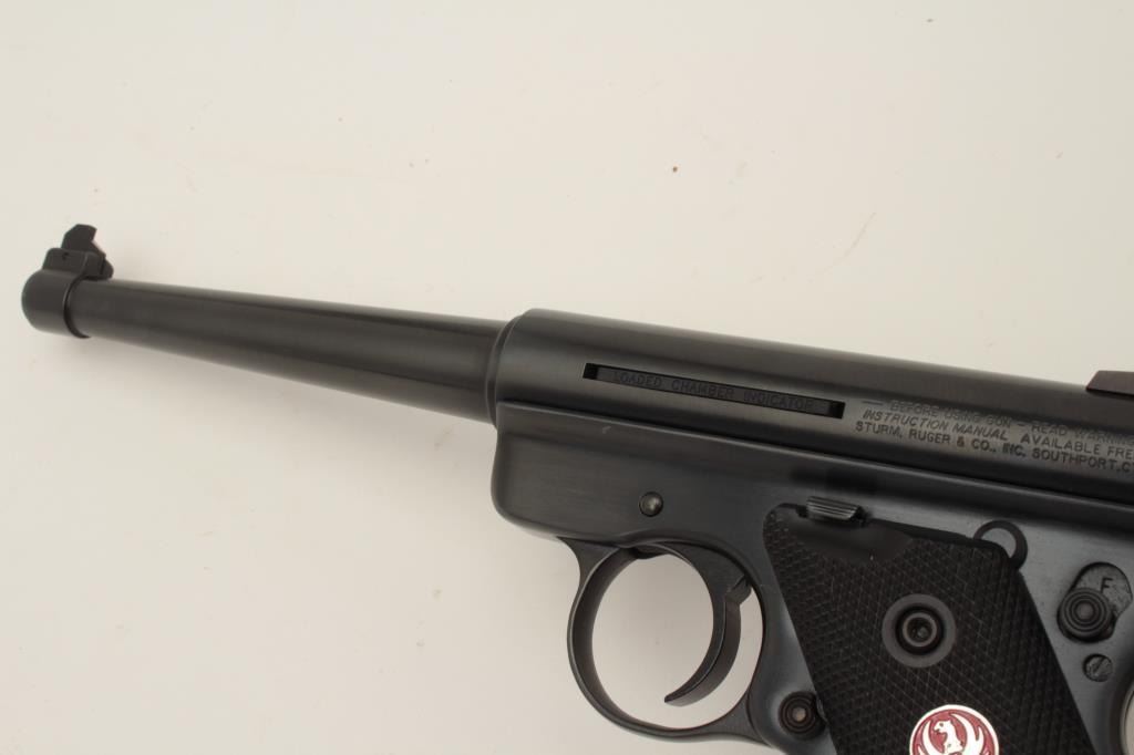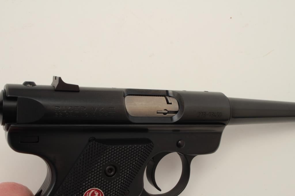 Ruger MK III semi-automatic target pistol with Val Quartzen bolt, .22LR caliber, 6” barrel, blued finish, checkered red medallion checkered grips, S/N 273-93450, in overall excellent condition. (Modern/PPT).Est.: $250-$500.