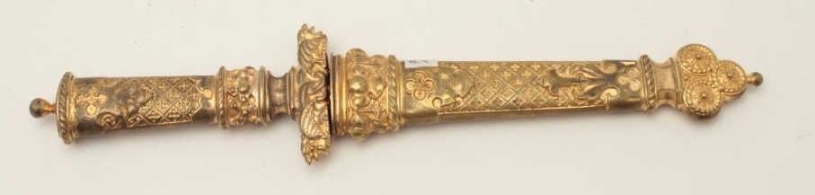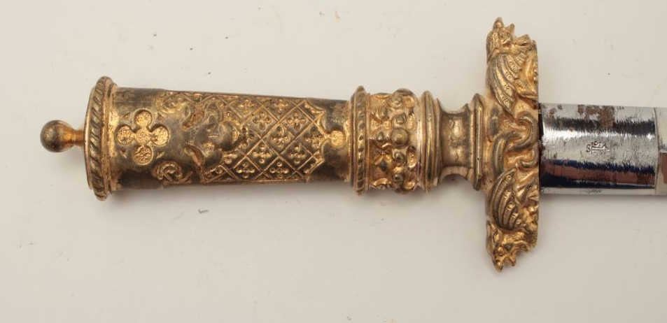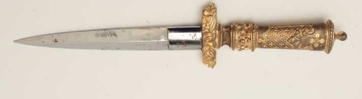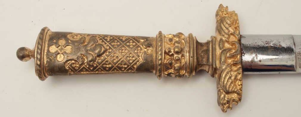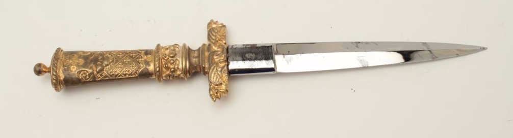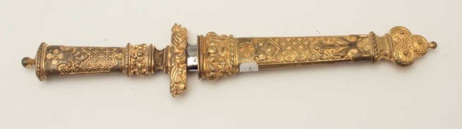 Lot 408 19th century cast bronze dagger in renaissance style with fancy decorations and rich gold gilt. Me