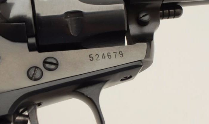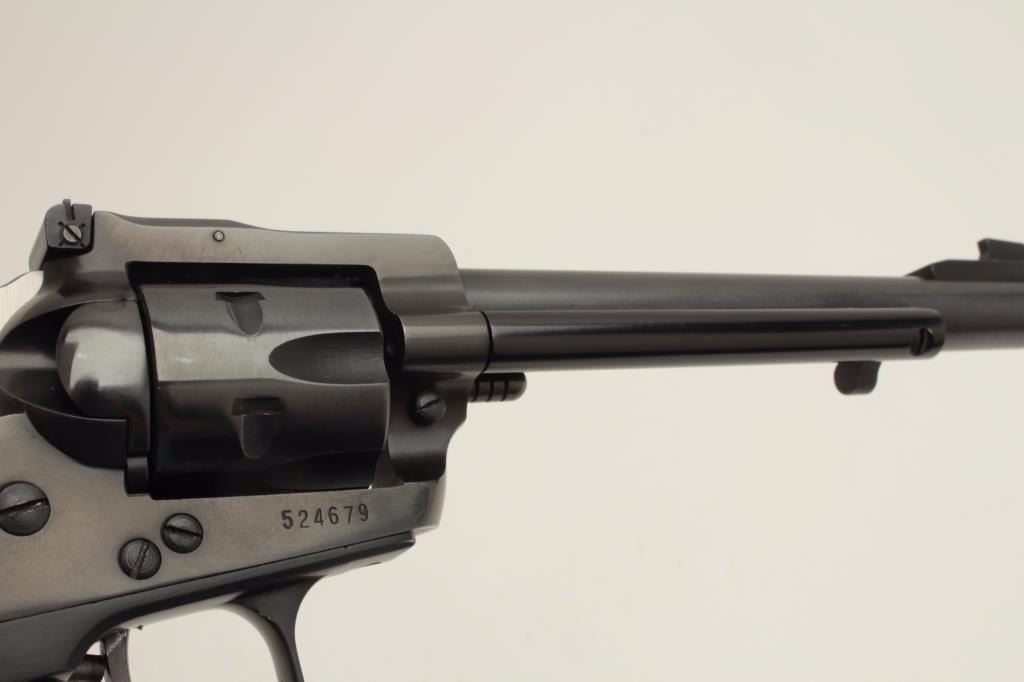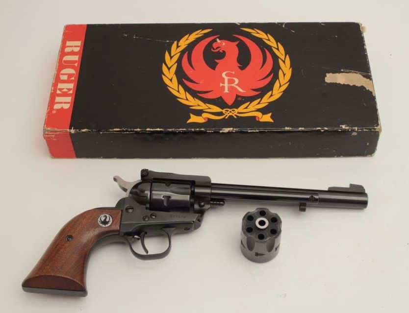 Ruger Model Single Six revolver, .22 caliber, 6.5” barrel, blued finish, smooth wood black medallion grips, 3-screw frame, S/N 524679, in factory two piece cardboard box with extra cylinder and misc. extra parts including ahammer, a trigger and cylinder pin. This gun is in overall fine condition with majority of its original finish, crisp action and markings, fine bore and grips. (Modern/PPT). Est.: $275-$550.