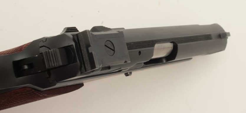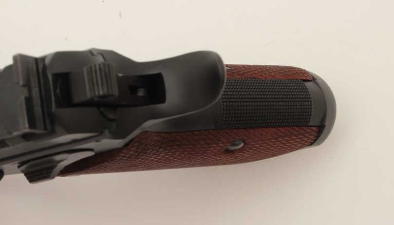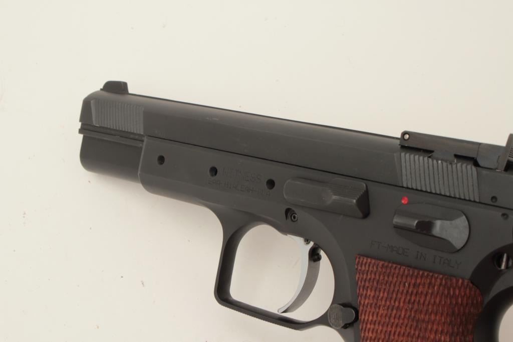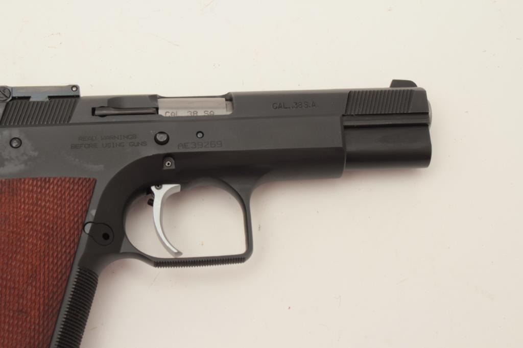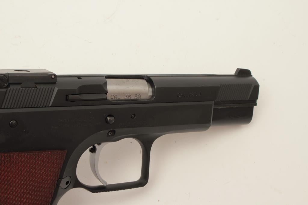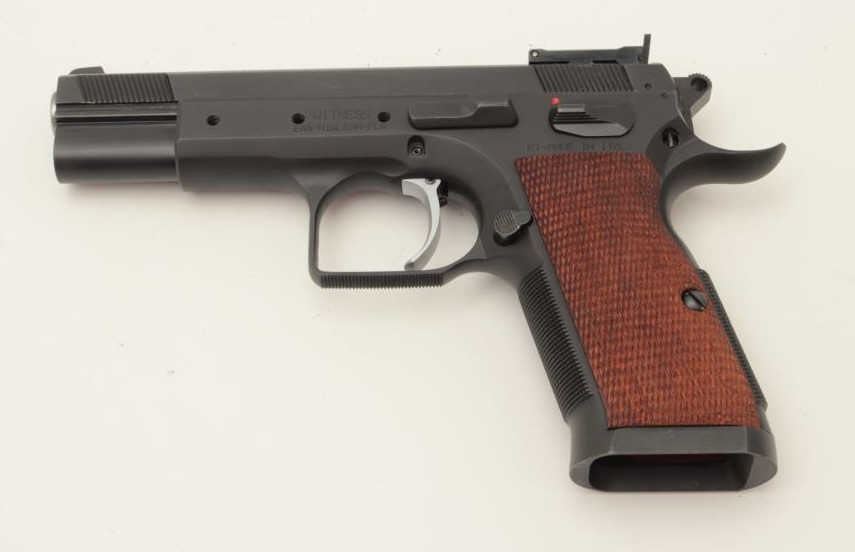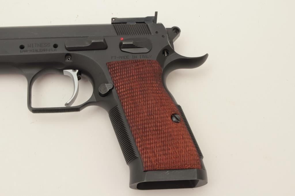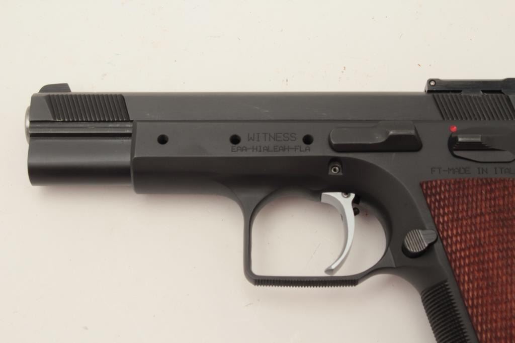 EAA Witness DA semi-automatic pistol, Italian-made, .38 S.A., 4.5” barrel, mat black finish, no magazine, checkered wood grips, S/N AE39269, in overall fine condition with a crisp action, sharp markings,majority of original finish, fine grips; left side of frame shows drilled and tapped holes for side secured scope mount. (Modern/PPT). Est.: $300-$600.