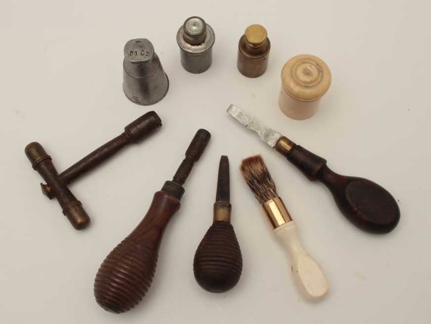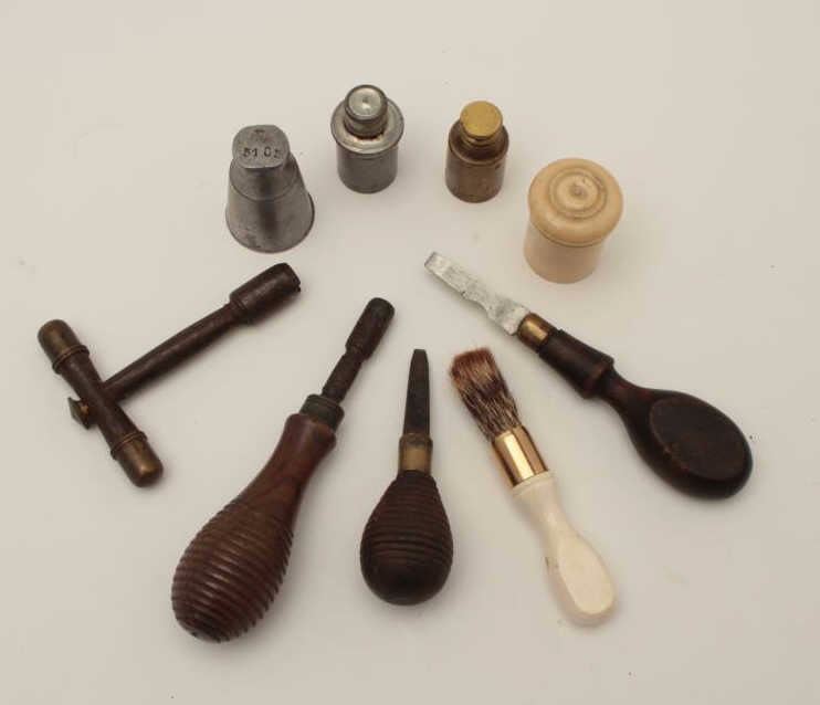 Collection of gun tools and accessories from 19th to 20th century. 1 English flintlock period screwdriver, mid-19th century matching screwdriver and nipple wrench from cased set, pocket nipple wrench with 2 screw offcompartments for caps, 3 metal oil bottle, 1 bone cap box, 1 bone handle and camel hair brush with gold plated ferrel for best quality English arm. A nice lot. Est.: $175-$350
