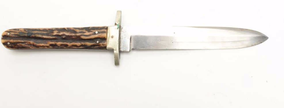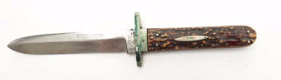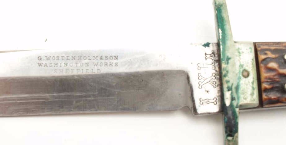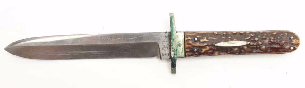 G. Wostenholm & Son IXL spear point bowie knife. The knife is in good overall condition with a 5 ¾” blade and 10” overall length. The pinned stag scales are in good condition with a great look. IXL marked atthe ricasso, the silver guard shows wear and verdigris. The blade shows scabbard wear, light staining and is marked, “G. WOSTENHOLM & SON WASHINGTON WORKS SHEFFIELD”. This is a great looking blade with some really nicestag scales. Est.: $200-$400.