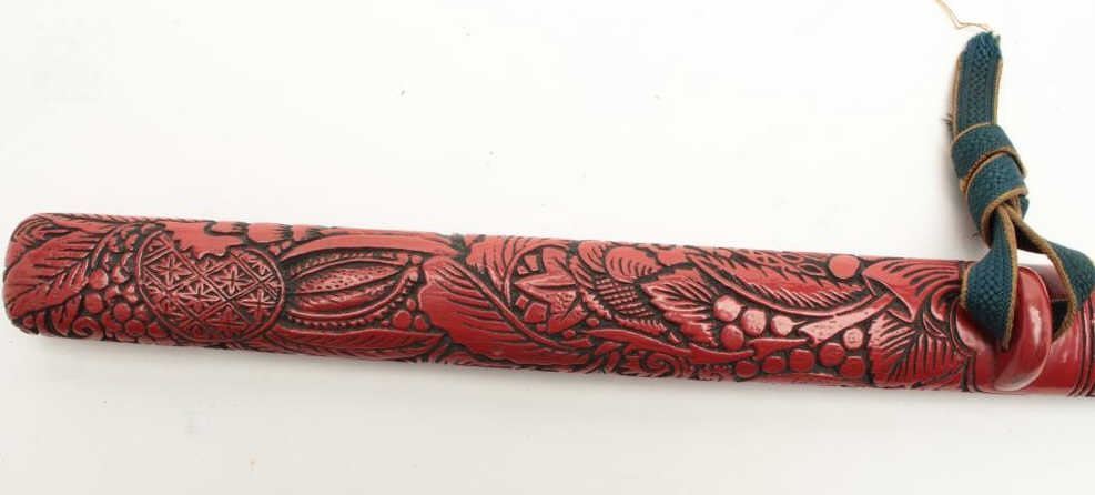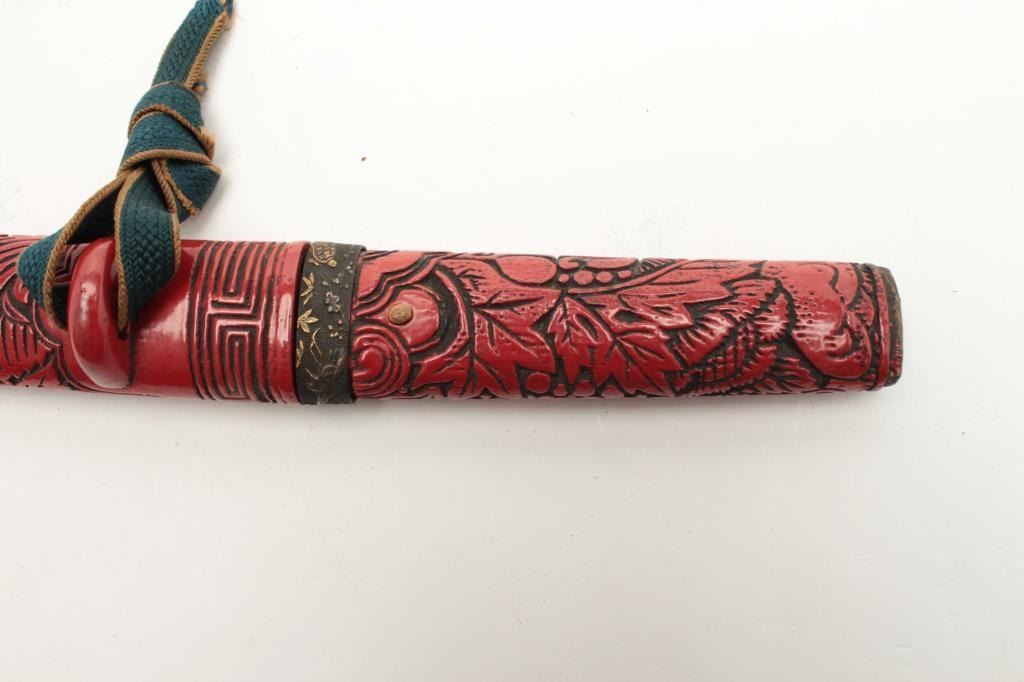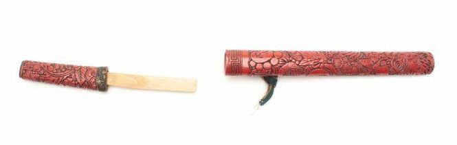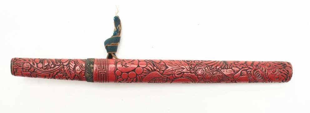 Japanese Cinnibar mounts for a Tanto sword. The lot includes the mounts without blade. Ornately carved with an overall length of 15 ½”, the mounts and scabbards are in good condition. Est.: $250-$500.