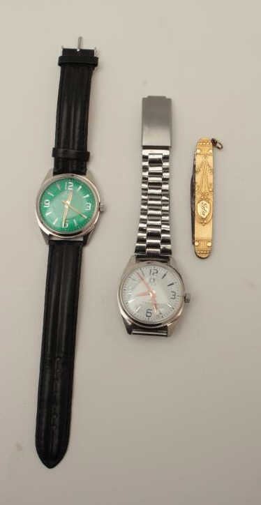 Men’s vanity lot as described: 2 Titus 17 jewel wrist watches and gold filled antique vest pocket knife.. Est.: $100-$200
