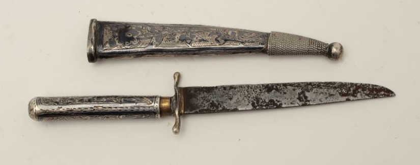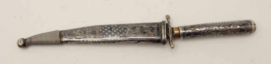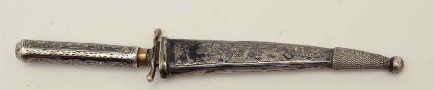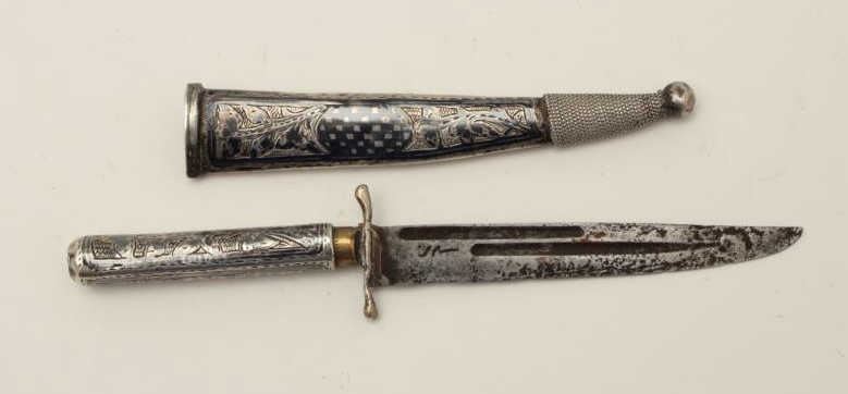 Lot 482 Niello silver mounted small dagger from Caucasian or Russian area. Measures 6 ¼” overall with a 3