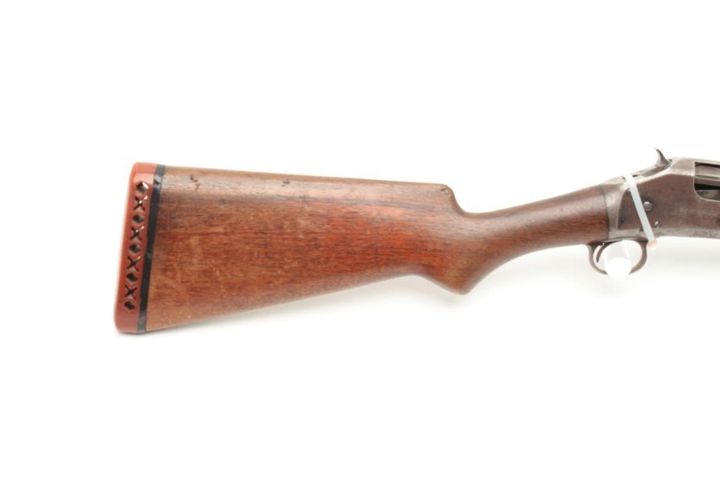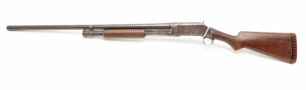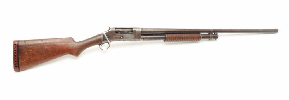 Winchester Model 1897 pump shotgun, 12 gauge, serial #539724. The shotgun is in good overall condition with a 30” barrel with a brass bead front sight. The barrel retains a significant amount of its muted blue finish, particularly in the protected areas. The receiver is a brown patina with small areas of original blue still evident. The smooth wood stocks are in good condition showing mars and compressions consistent with use.The butt stock ends with a ventilated rubber pad and a 14” LOP. The bore is good, the action crisp and markings are sharp. (C+R) Est.: $175-$350.