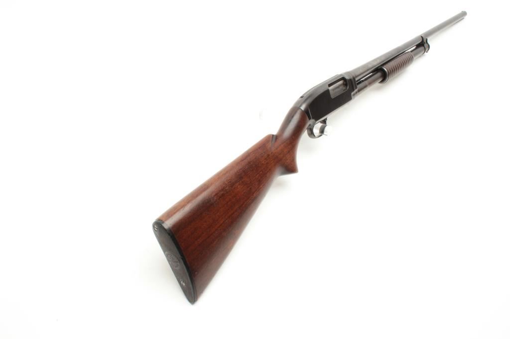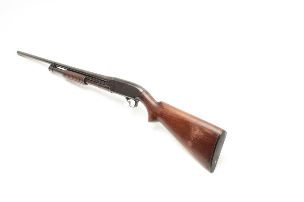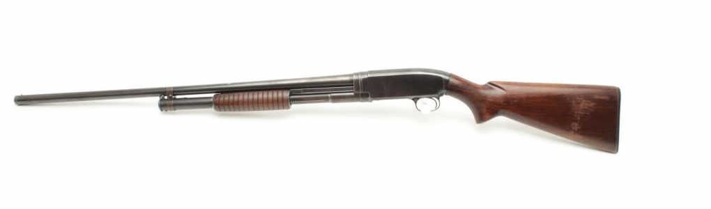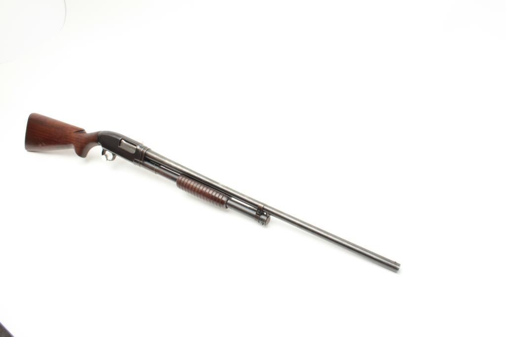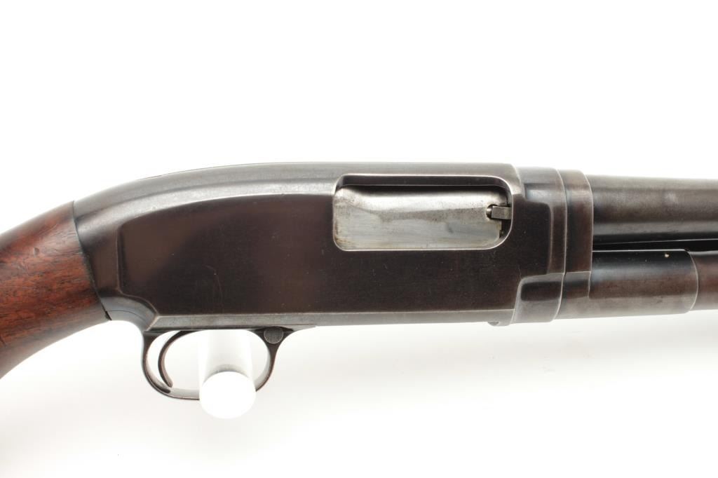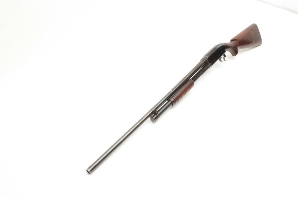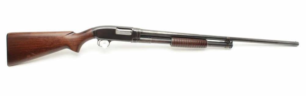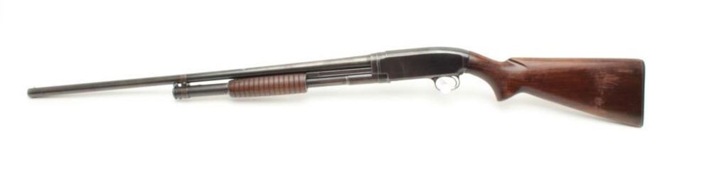 Winchester Model 12 pump shotgun, 16 gauge, serial #915721. The shotgun is in good overall condition with a 28” barrel with a steel bead front sight. The barrel retains the majority of its thinning blued finish.The receiver has significant original muted blue finish with high point edge wear noted. The smooth wood stocks are in good condition showing scrapes and mars consistent with use. The butt stock ends with a hard rubberWinchester marked butt plate and a 14” LOP. The bore is good, the action crisp and markings are sharp. (C+R) Est.: $250-$500.