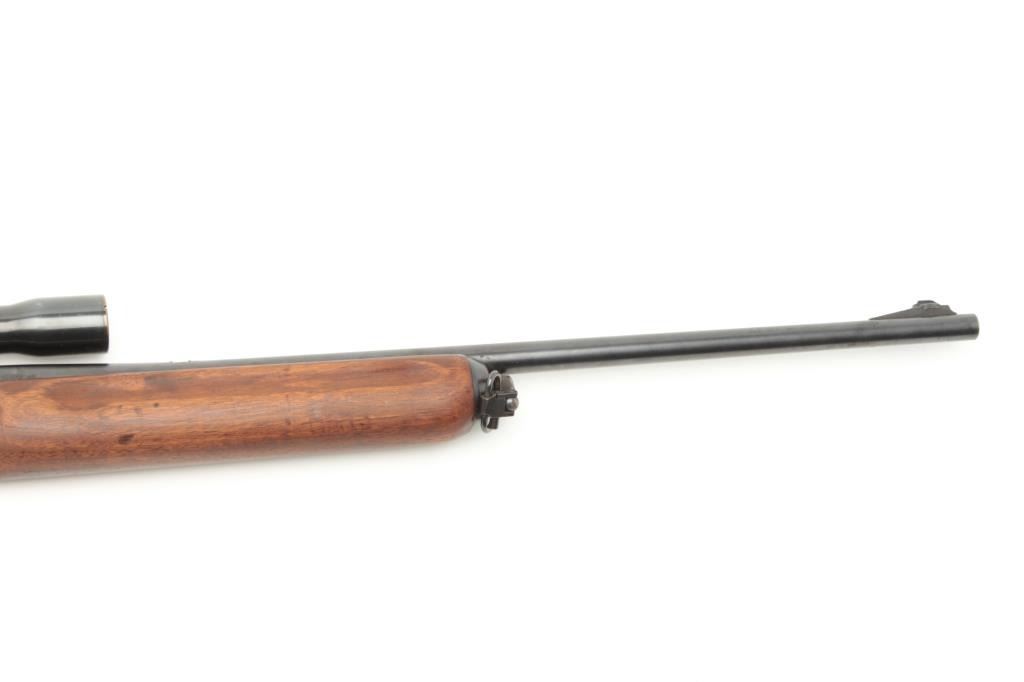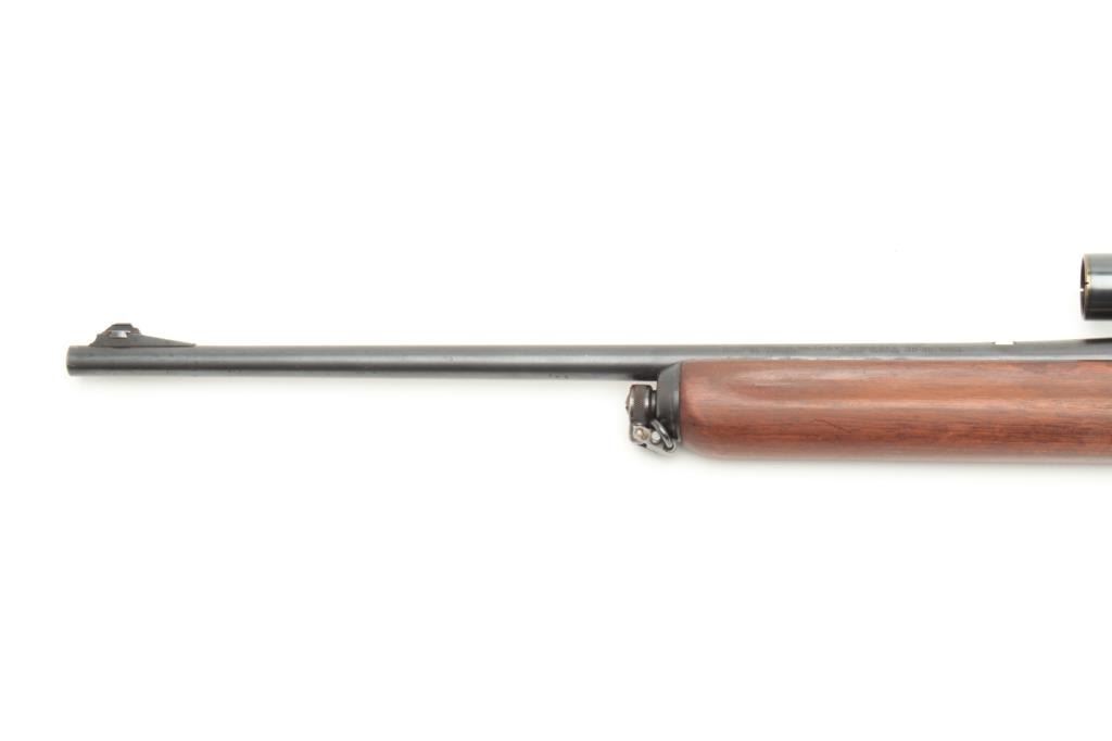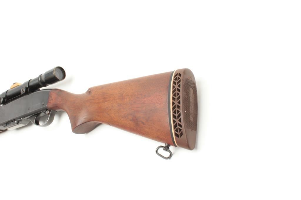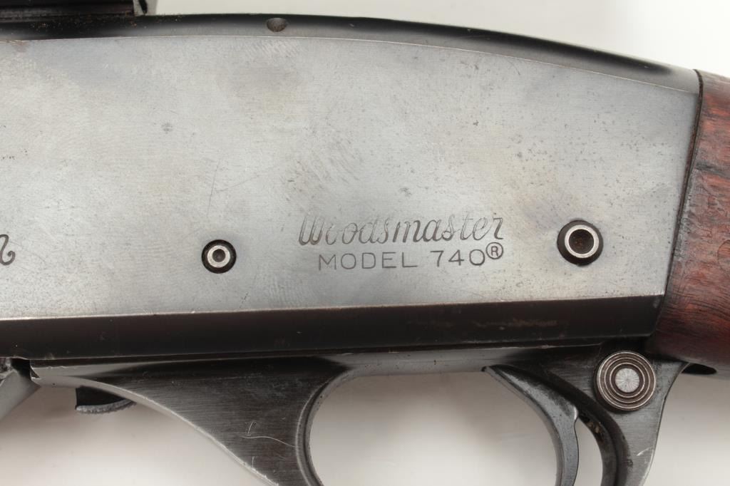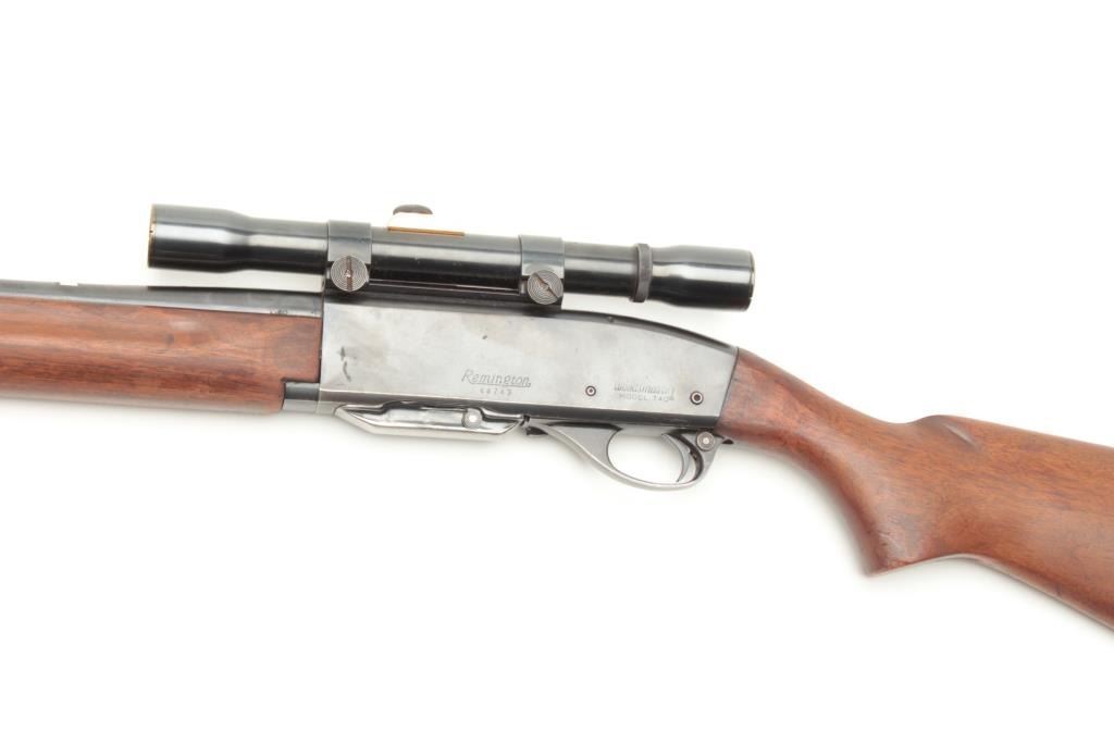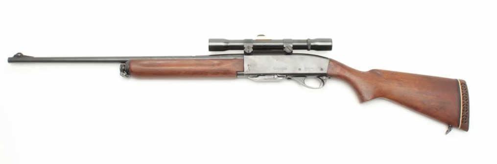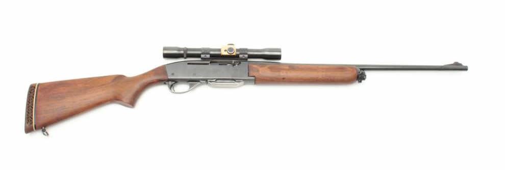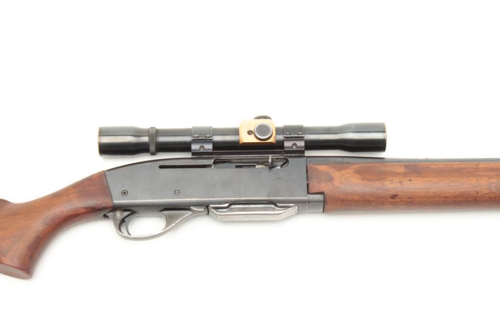 Remington Model 740 semi-auto rifle, .30/06 Springfield caliber, serial #44743. The rifle is in good overall condition with a 22” barrel with a ramp front and rear sight removed. The barrel and receiver retain themajority of their blued finish with muzzle wear and some light surface rust evident on the action. The smooth wood stocks have been lightly sanded but remain in good condition. The butt stock ends with a ventilatedrubber White Line pad. The rifle is topped with a one-piece scope mount, Weaver rings and a JC Higgins Rifleman 4x fixed power scope. (Modern) Est.: $300-$600.