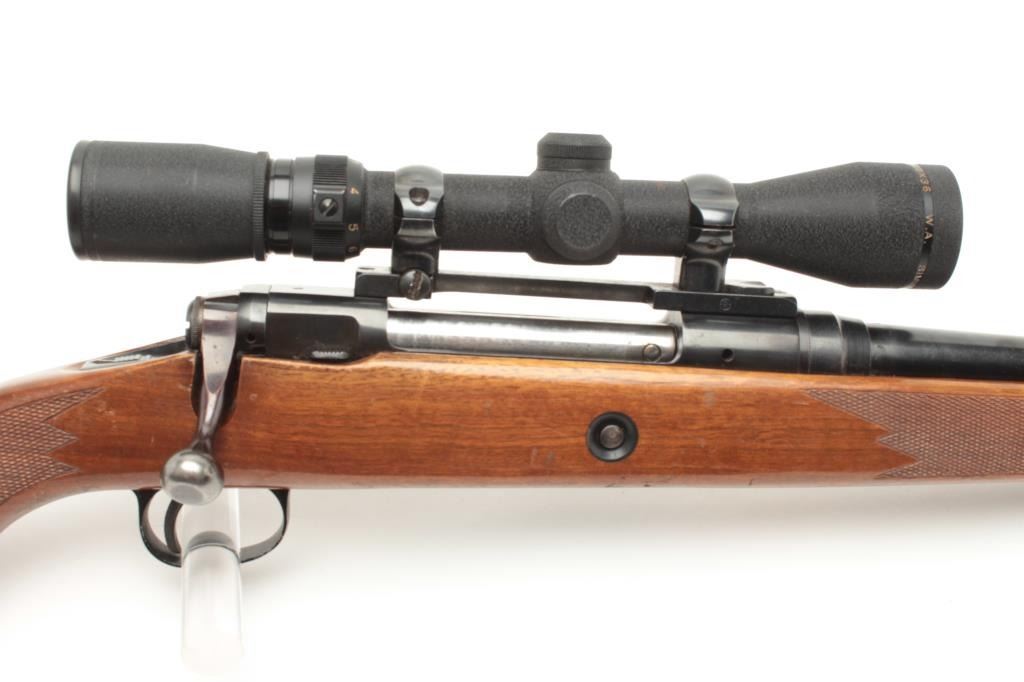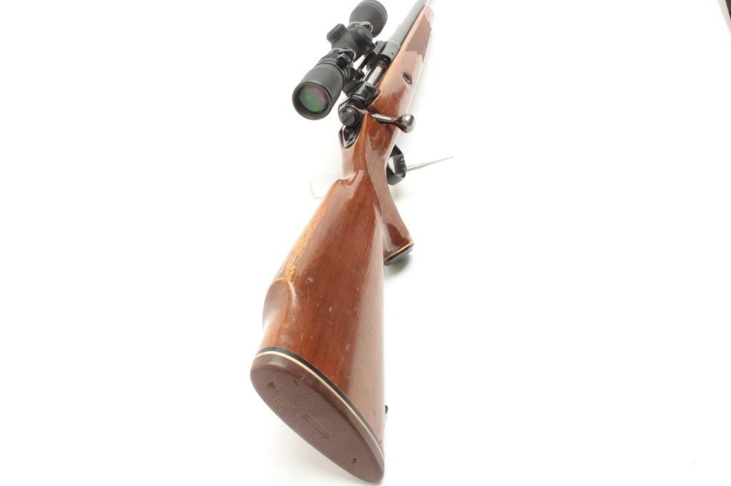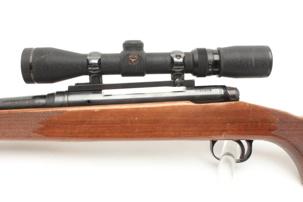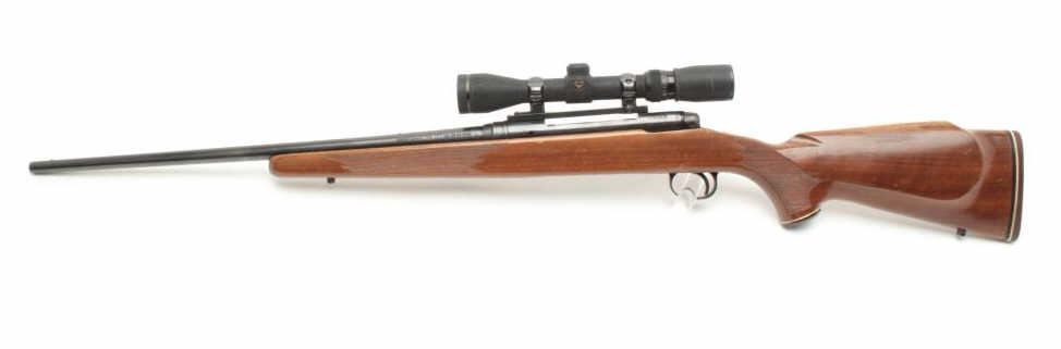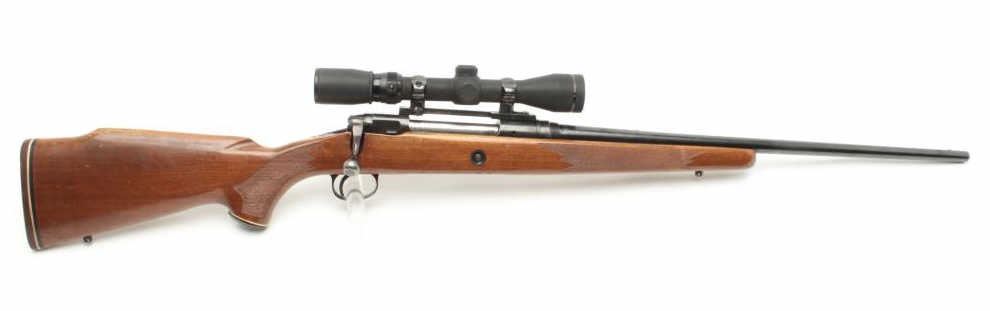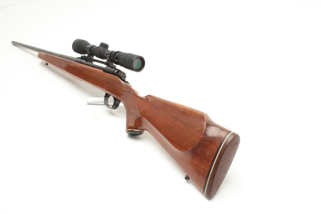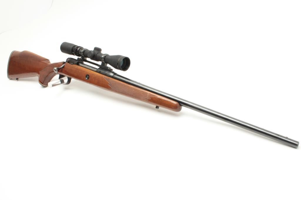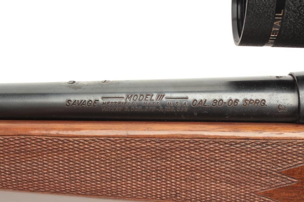 Savage Model 111 bolt action rifle, .30/06 Springfield caliber, serial #B782626. The rifle is good overall condition with a 22” barrel which retains the majority of its blued finish with light muzzle wear and thefront and rear sights removed. The receiver shows a significant amount of its muted blue finish with a blind magazine. The checkered wood stock is in good condition showing moderate wear and mars consistent with use.The butt stock ends with a rubber recoil pad. The bore is good, the action functions and markings are sharp. The receiver is topped a one-piece Redfield scope mount with a Simmons Whitetail 2.5 x 8 x 36 variable power scope. (Modern) Est.: $300-$600.