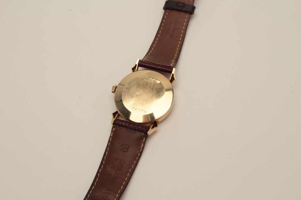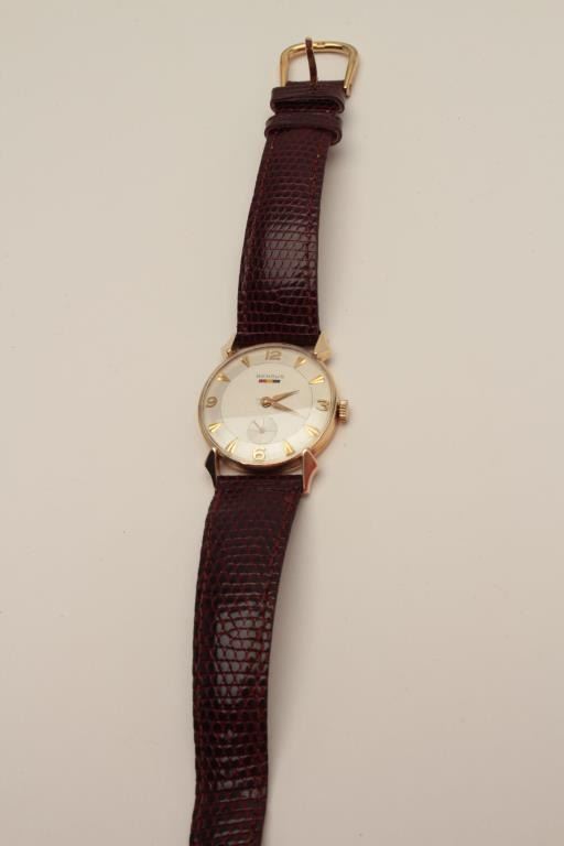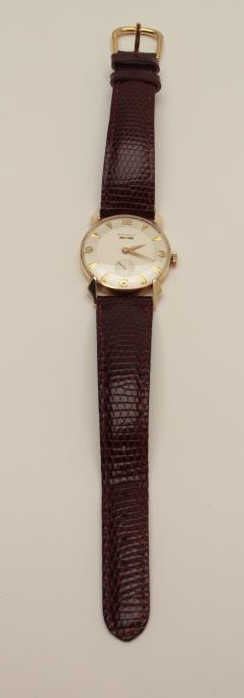Lot 491 Vintage Benrus mans wristwatch, 14K marked; small size; fancy numerals and lugs; unusual; good run