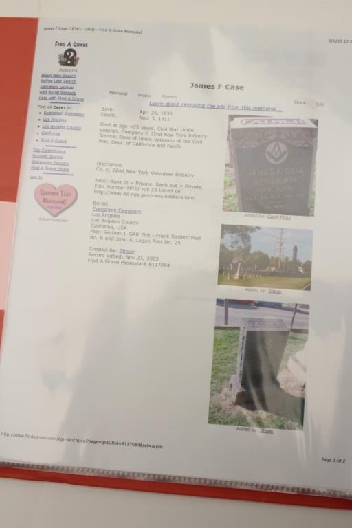 Three ring binder of photos and information on Civil War Veteran James F. Case, Co. E, 22nd N.Y. Infantry. Case enlisted on May 7, 1861 at Glens Falls, NY as a Private and mustered out at Albany, NY on June 19, 1863.His Regiment saw service at Second Bull Run, VA., South Mountain, MD., Antietam, MD. and Fredericksburg, VA. Case ultimately retired to Santa Ana, CA. and died on 5 Nov. 1911. Pictures in the binder include him in hisCivil War uniform, him in his later years with family, other family members, his home in Santa Ana ca. 1896 and ca. 1901. Also pictures of his grave site at Evergreen Cemetery in Los Angeles, CA. Est.:$100-$150.