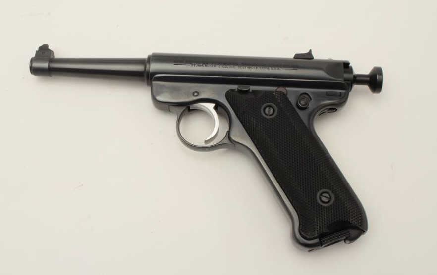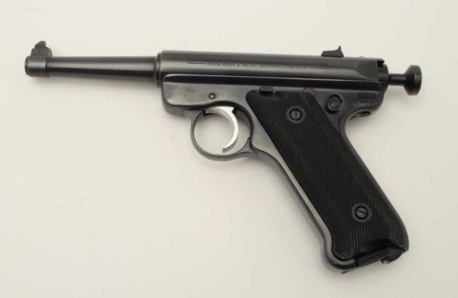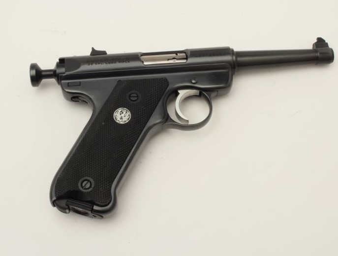 Ruger MK II semi-automatic pistol, .22LR caliber, 4.5” barrel, blued finish, checkered black medallion grips, Val Quartsen bolt, S/N 217-10989, in overall excellent condition showing little handling. Accompanied by 2extra magazines. (Modern/PPT). Est.: $250-$500.