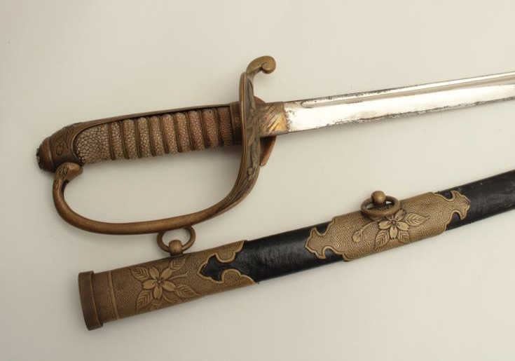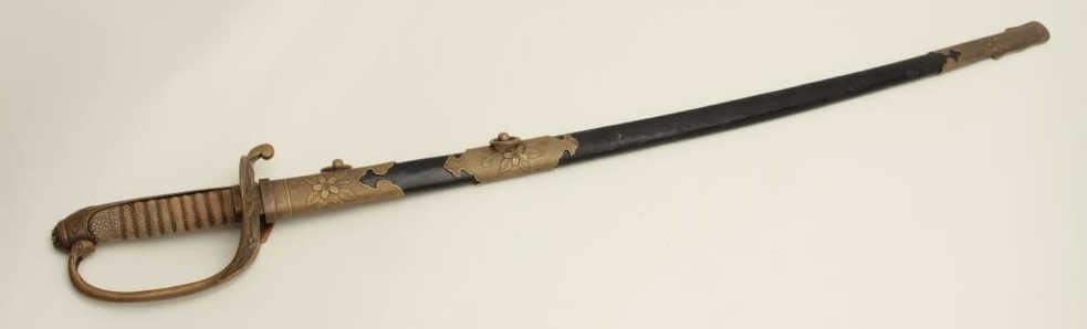 Japanese military dress sword with brass mounted leather scabbard; rayskin grip. Est.: $200-$400.