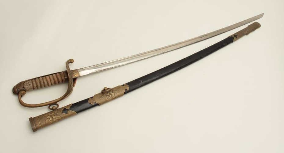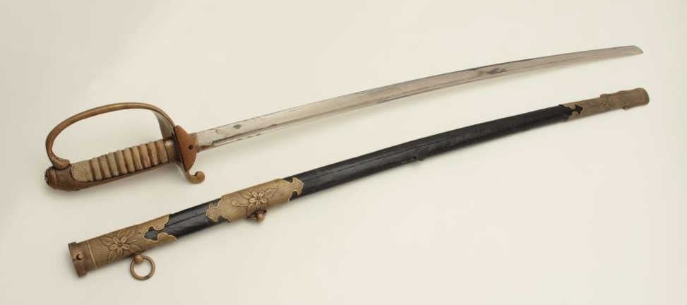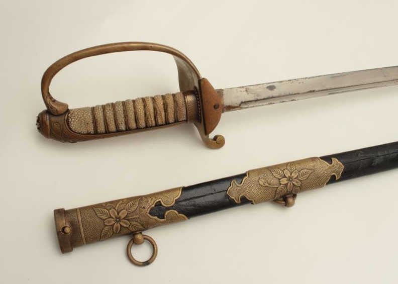 Lot 516 Japanese military dress sword with brass mounted leather scabbard; rayskin grip. Est.: $200-$