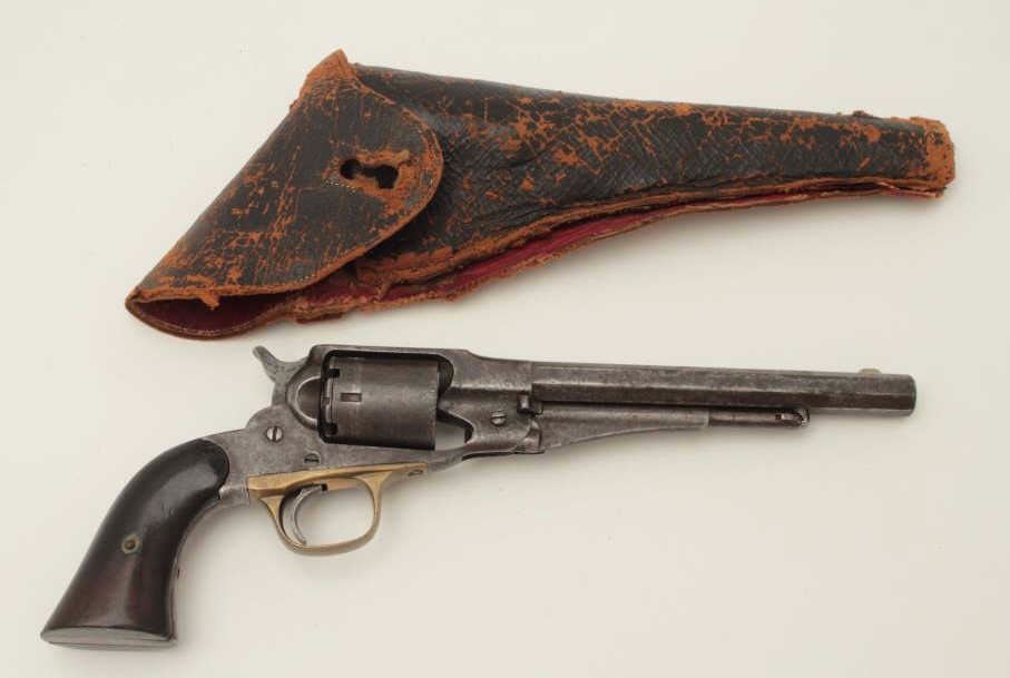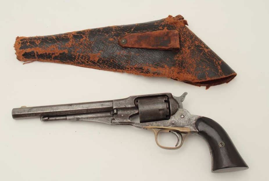 Remington New Model Police 6.5” long barrel conversion, .38RF caliber, dark patina and scattered pinprick pitting, working action, good grips, with period lined holster that is in need of some TLC and re-stitching; from a Northern California collection. (Antique). Est.: $350-$700.