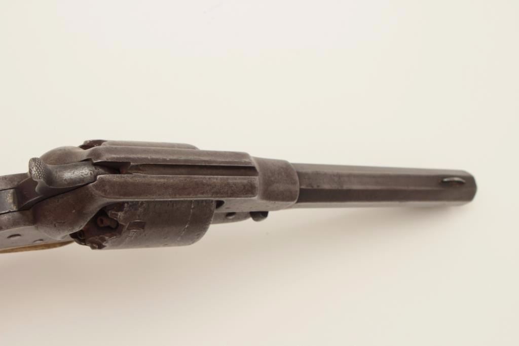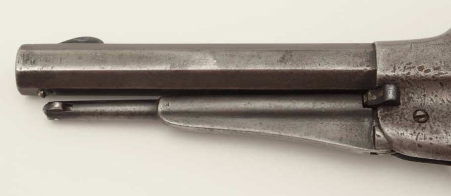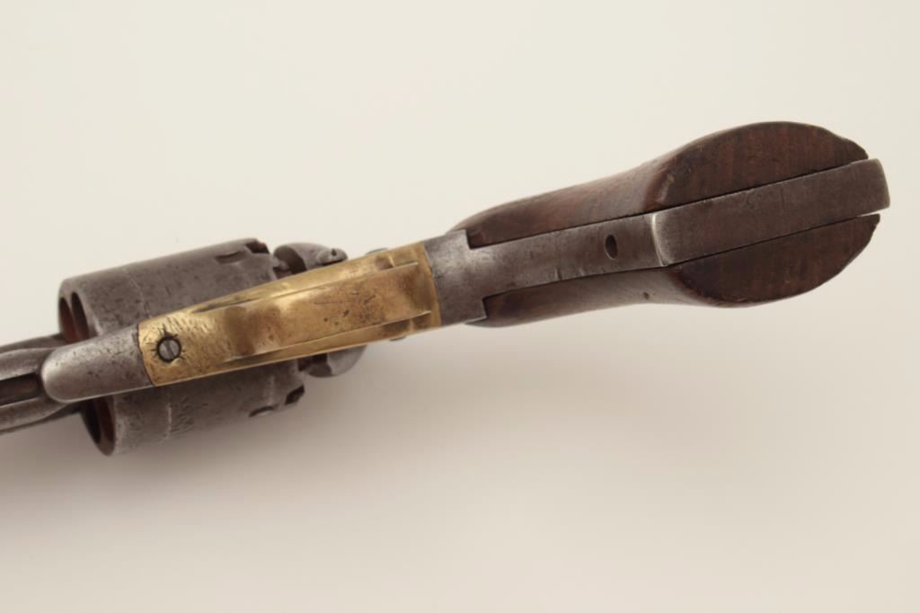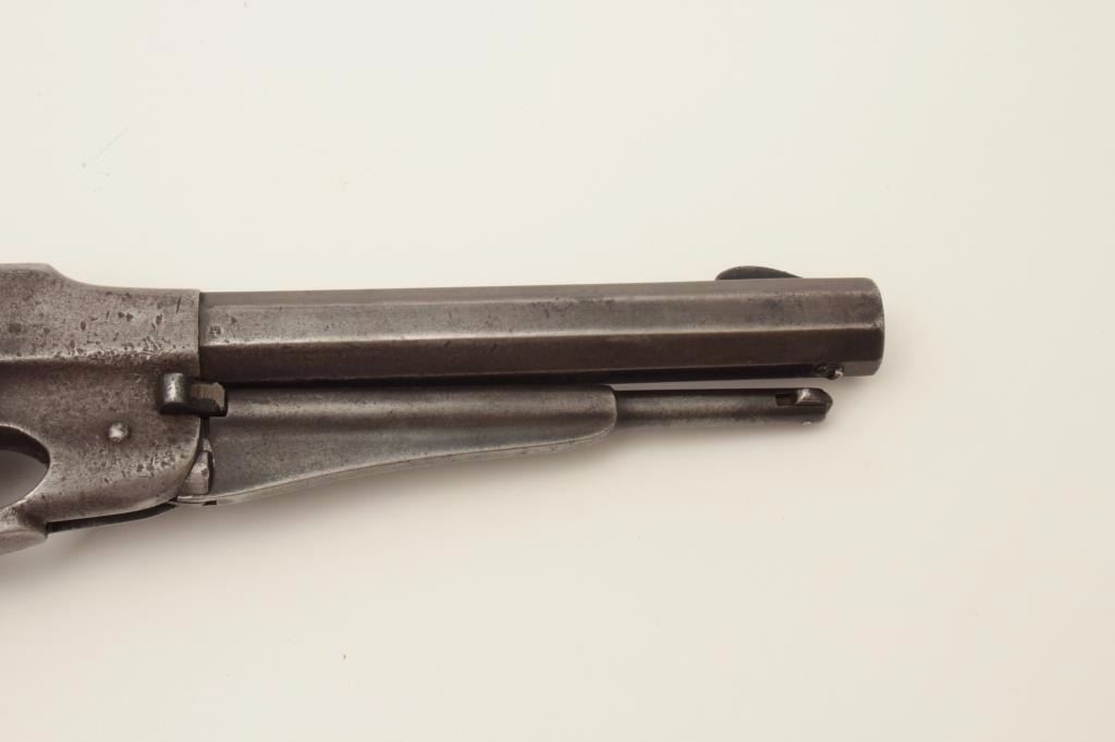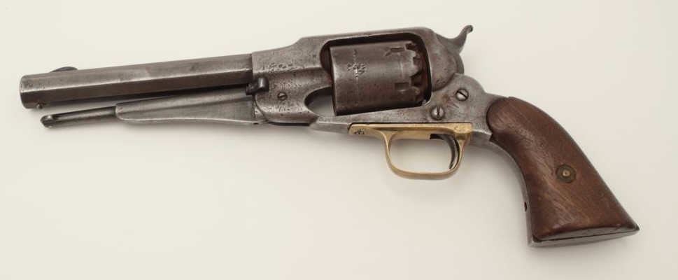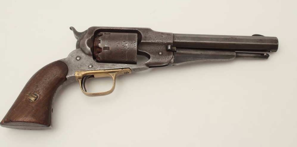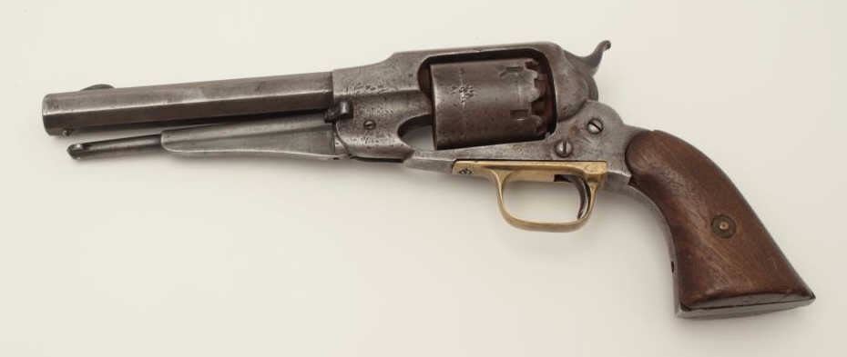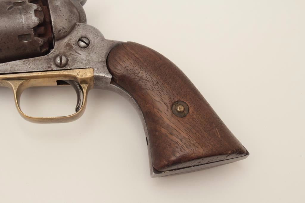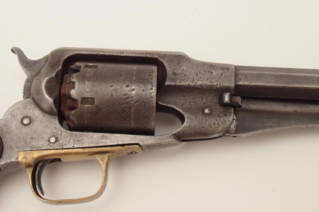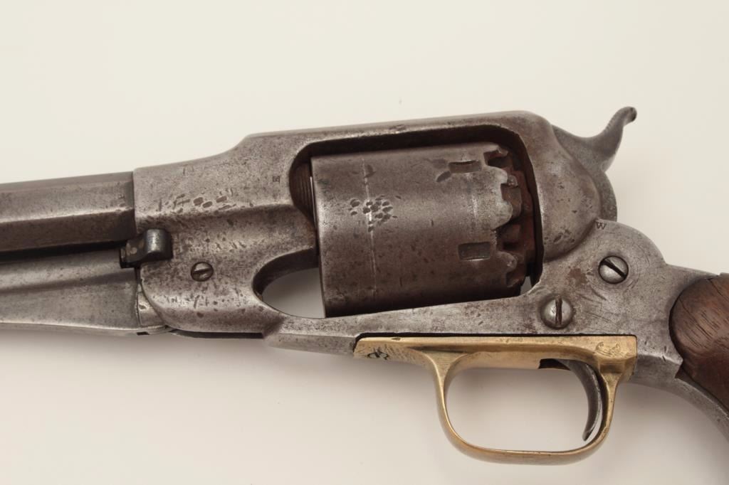 Remington New Model 1858 percussion revolver, S/N 23427, barrel shortened to 6.5”, wood grips, grey patina, action not working, loading lever latch at front of barrel is missing; replaced grip screw and front sight. (Antique). Est.: $300-$600.