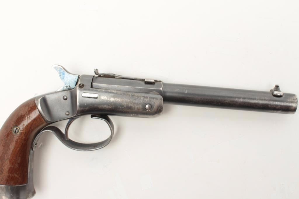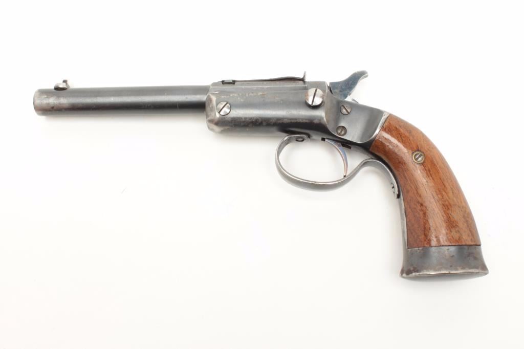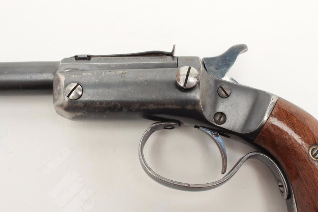 Stevens Conlin single shot pistol, .22 caliber, 6” barrel, blued finish, wood grips, S/N 31426, in overall very good condition showing considerable muted blued finish, very good bore, crisp action, very good markingsand grips. (Antique). Est.: $200-$400.