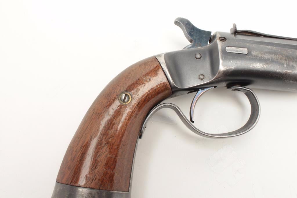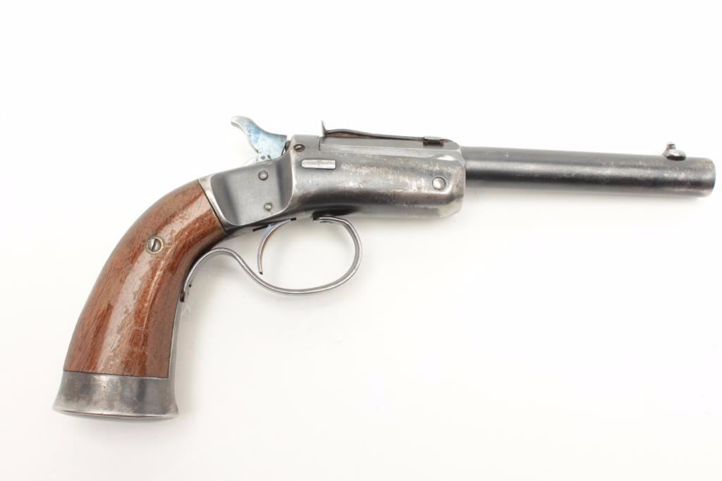Lot 529 Stevens Conlin single shot pistol, .22 caliber, 6” barrel, blued finish, wood grips, S/N 31426, in