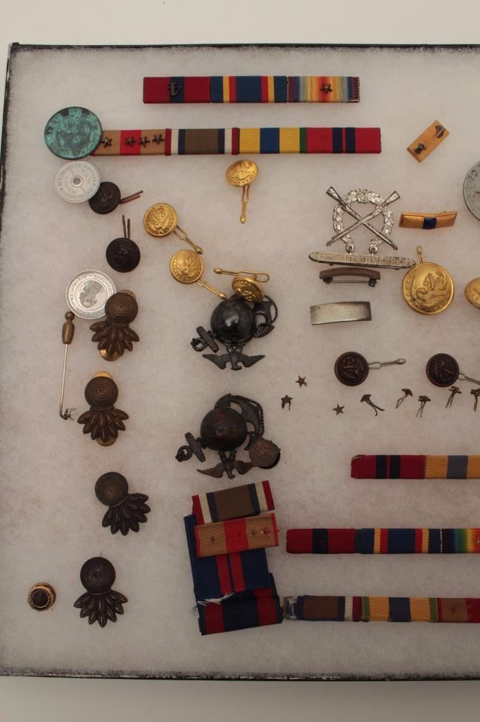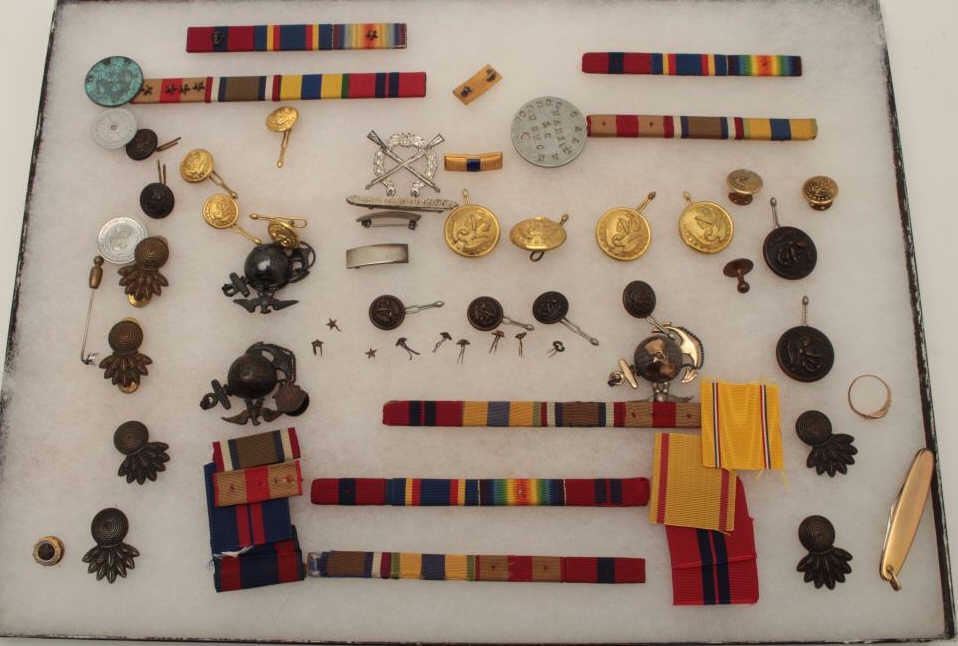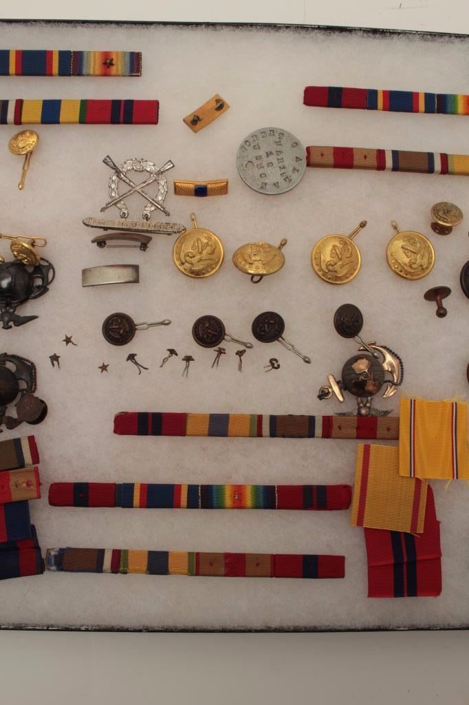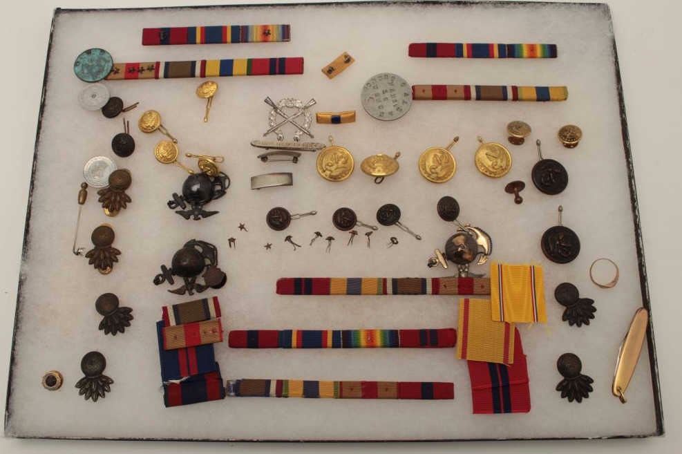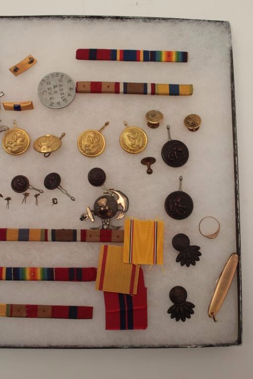 Riker case of U.S. ribbons, dog tag, buttons, etc. for U.S.M.C. soldier Robert C. Allan; dog tag is dated “Mar 19 18”; would be interesting to further research this Marine’s history. Est.: $100-$150.