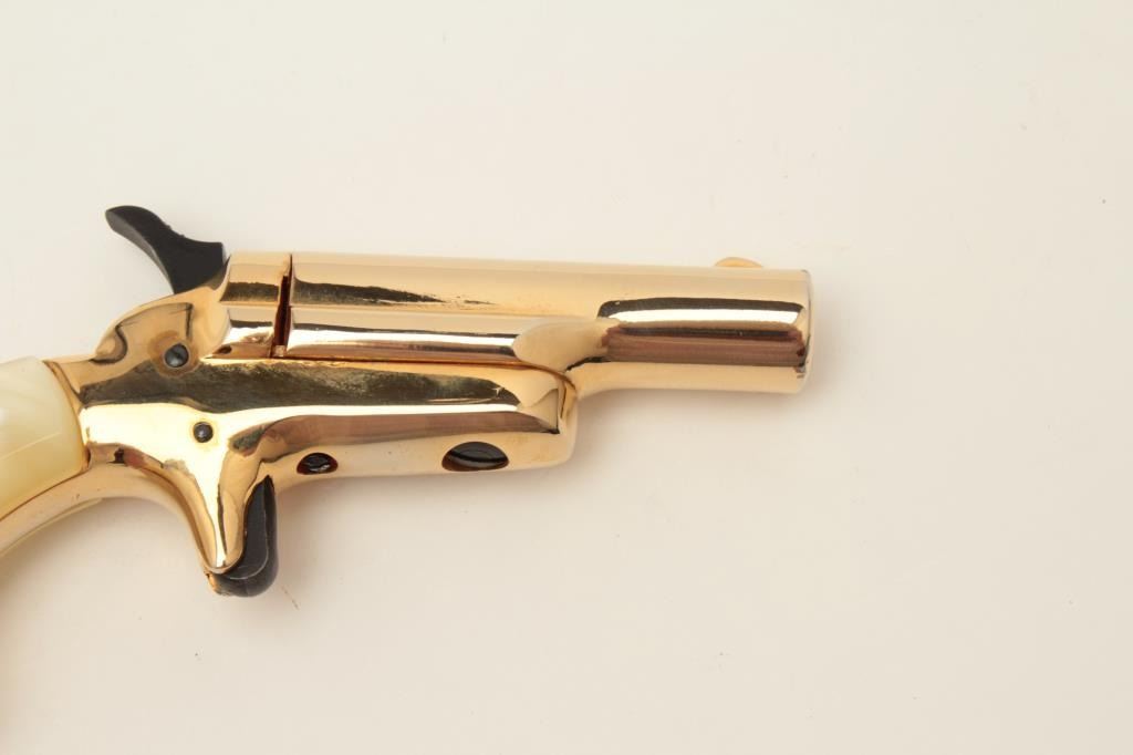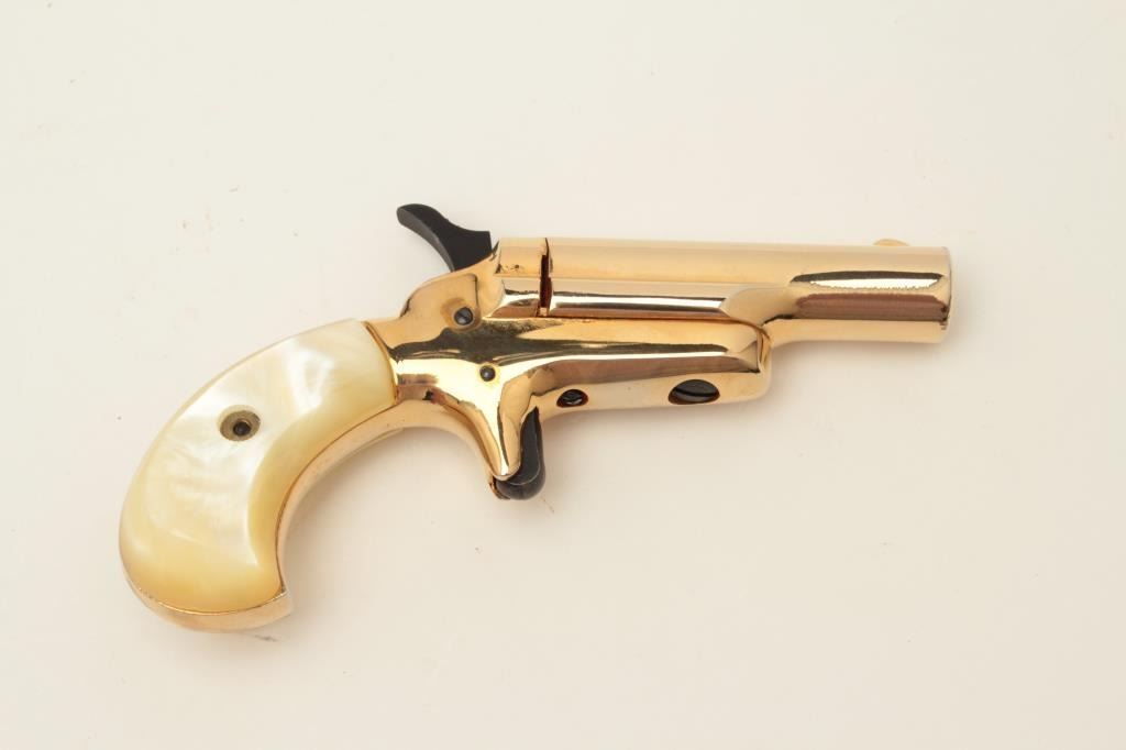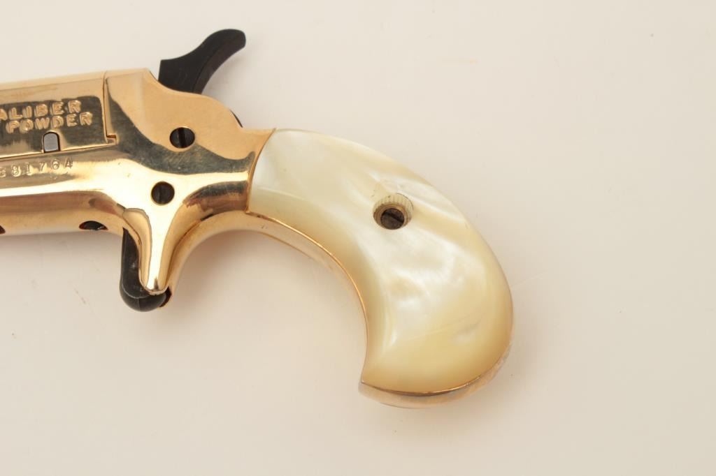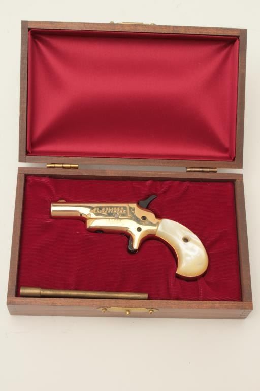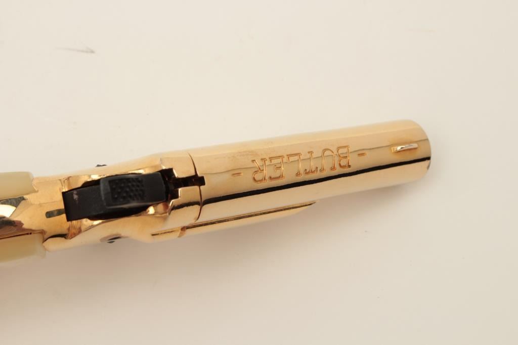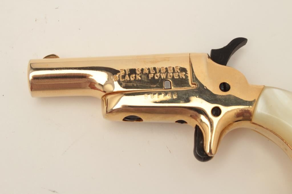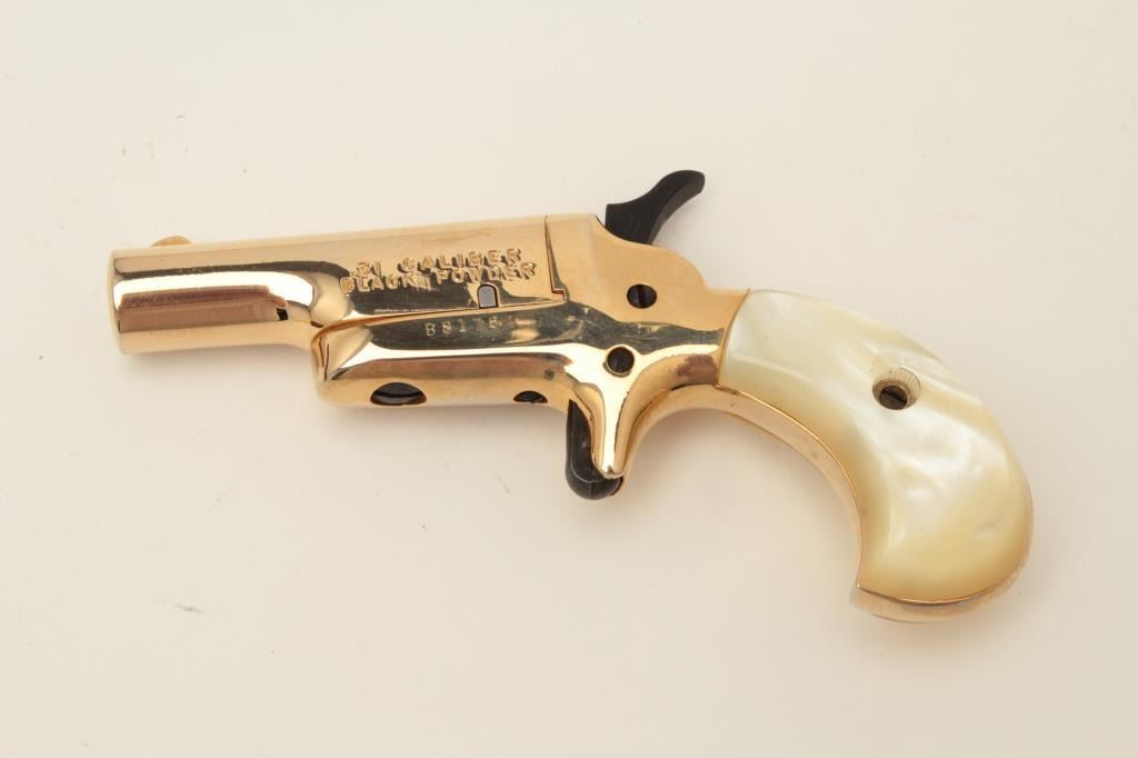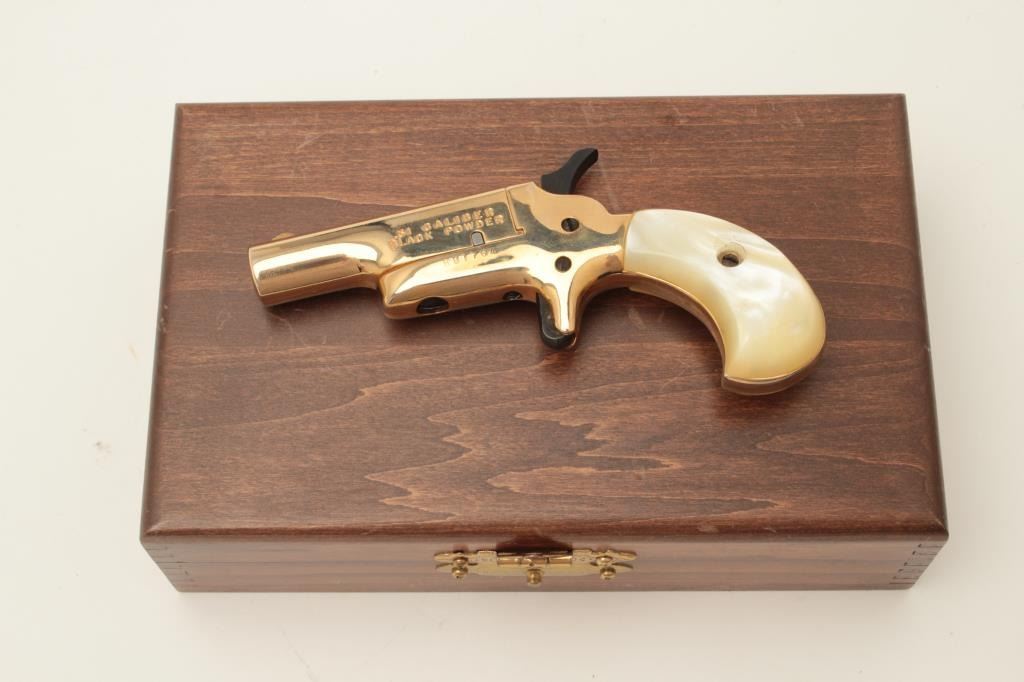 Butler blackpowder single shot derringer, .31 caliber, gold finish, faux pearl grips, S/N B81764, in overall fine condition and in lined wood display case. Est.: $75-$150.