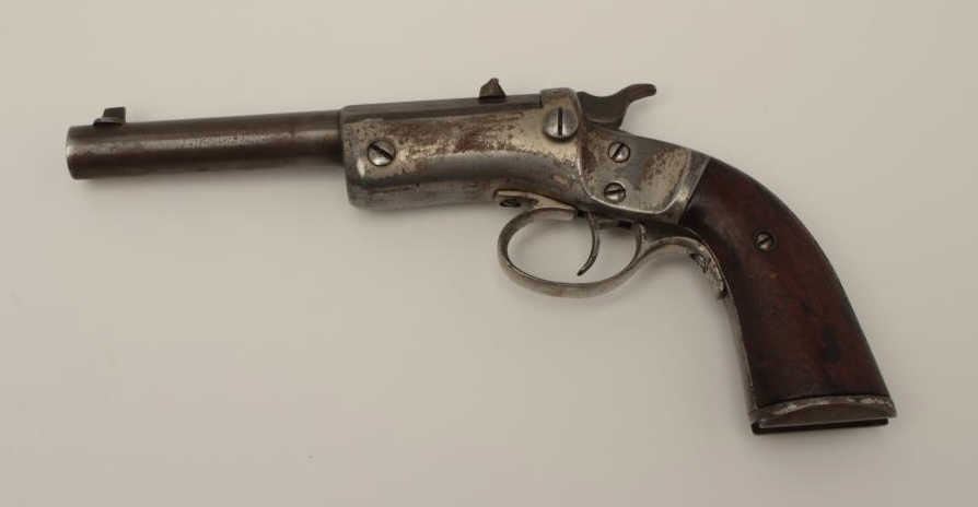 Lot 542 Stevens single shot tip-up pistol, .22 caliber, 5” barrel, wood grips, S/N 29574; dark patina to b