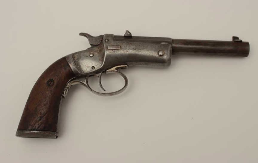 Stevens single shot tip-up pistol, .22 caliber, 5” barrel, wood grips, S/N 29574; dark patina to barrel, traces of nickel on frame, good bore, action and markings, good wood; cut for shoulder stock (stock notincluded). (Antique). Est.: $150-$300.