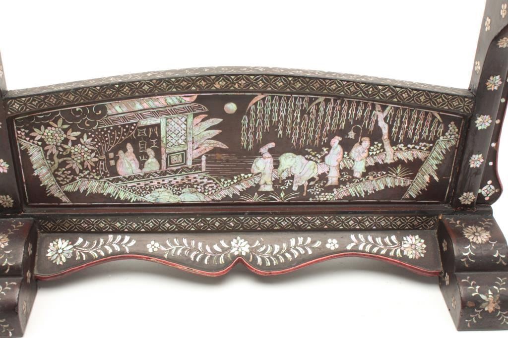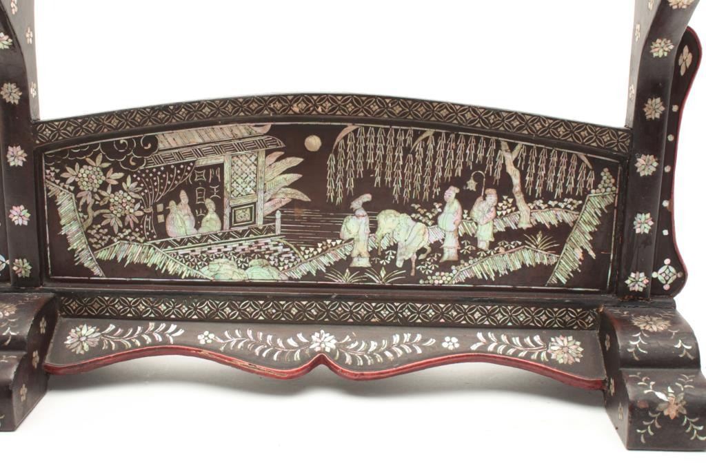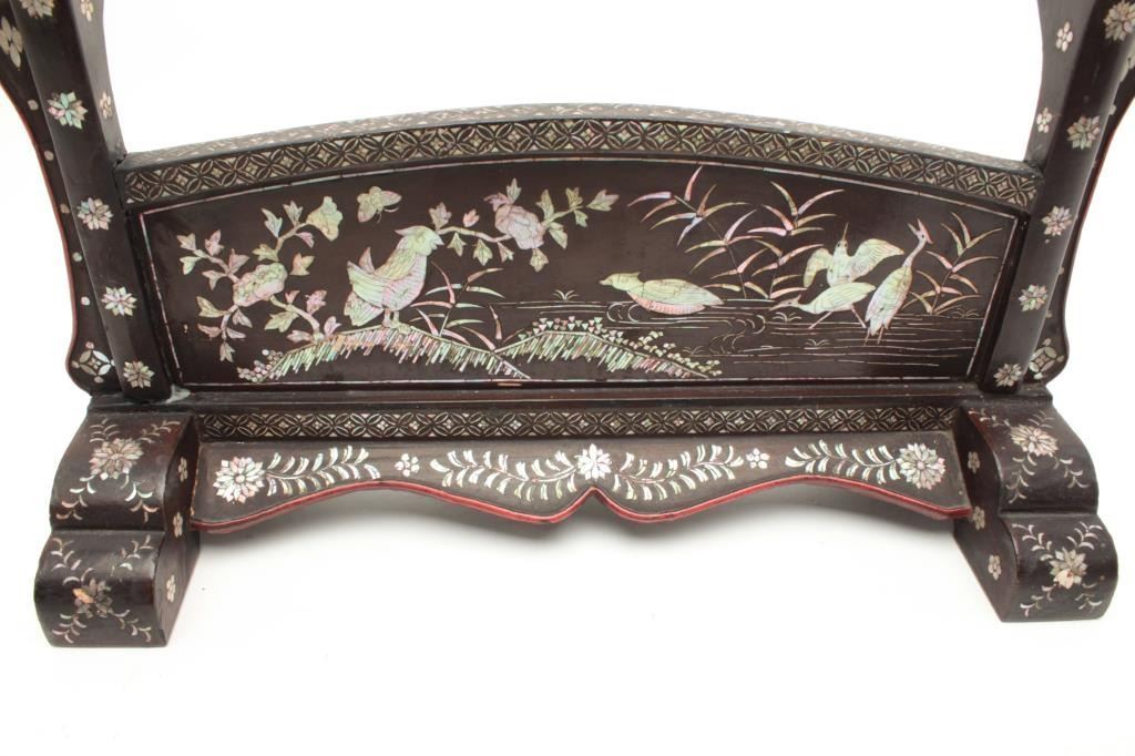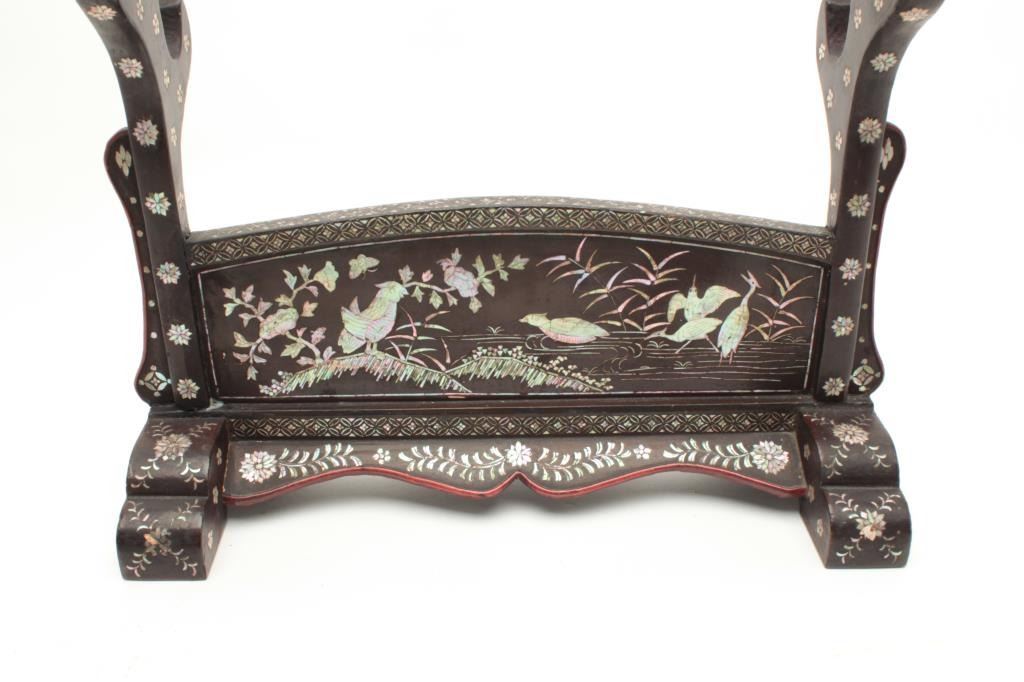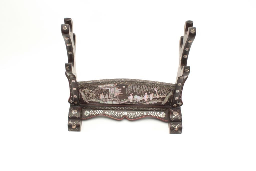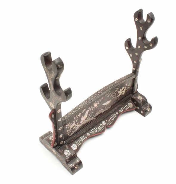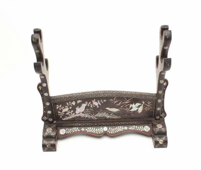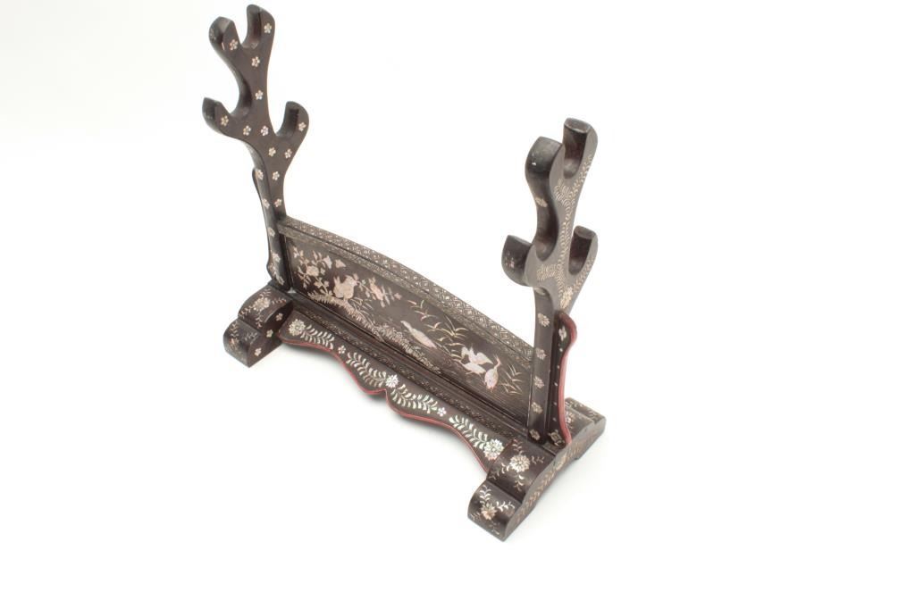 Lot 551 Pearl inlaid and ornate stand for 3 Japanese swords. Measures 16 ½” in height by 17” wide. In good
