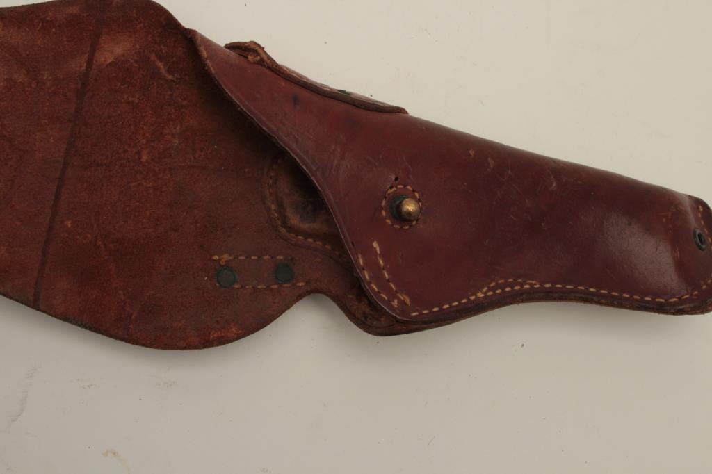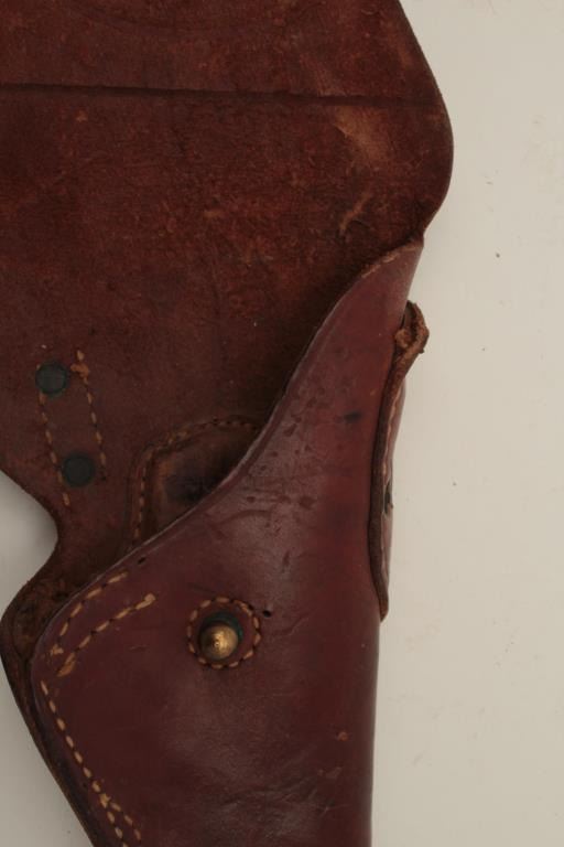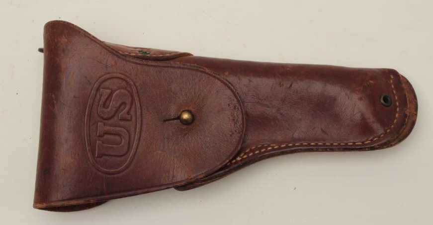 Lot of two U.S. marked flap holsters. The lot includes two U.S. marked leather holsters, each approximately 10” in length and marked U.S. on the front flap. The first is marked, “BOYT 42” on the rear side. Theoverall condition is good with a brass bead closure on the front and metal hanger on the rear. The second holster is marked, “HOYT 1918 J.J.M.” under the flap. The holster is in good condition with some oil soaking andcrazing of finish at the top. Est.: $75-$150.