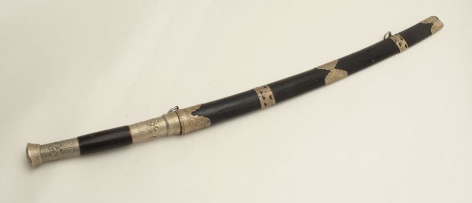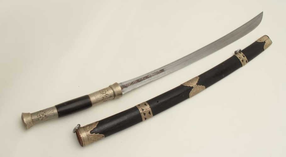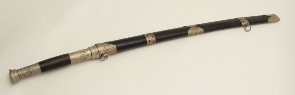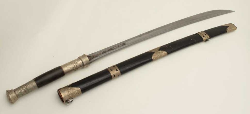 Lot 561 Southeast Asian Da with scabbard, approximately 33” overall. Est.: $75-$150.