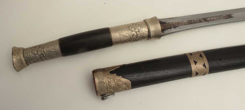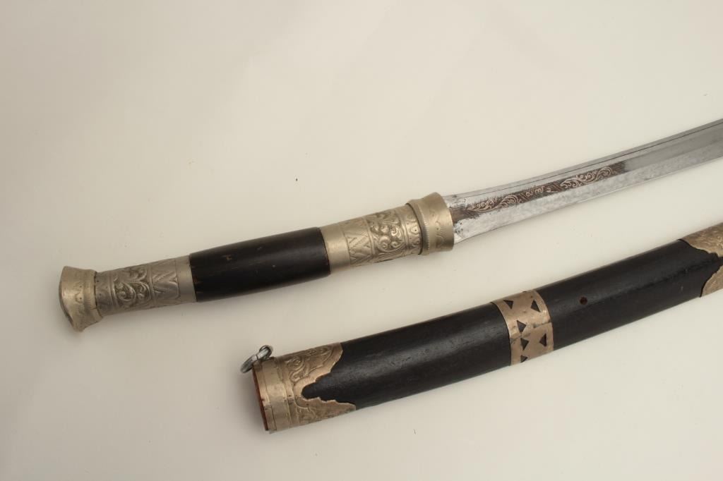 Southeast Asian Da with scabbard, approximately 33” overall. Est.: $75-$150.