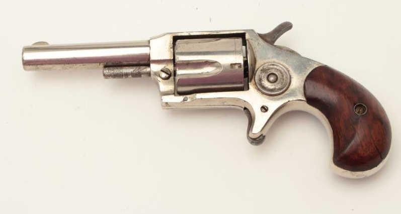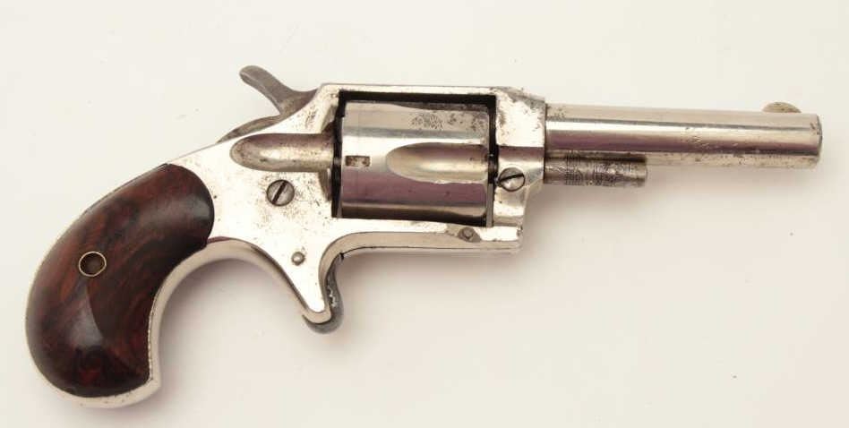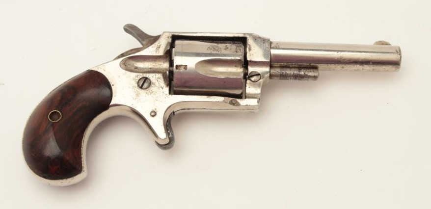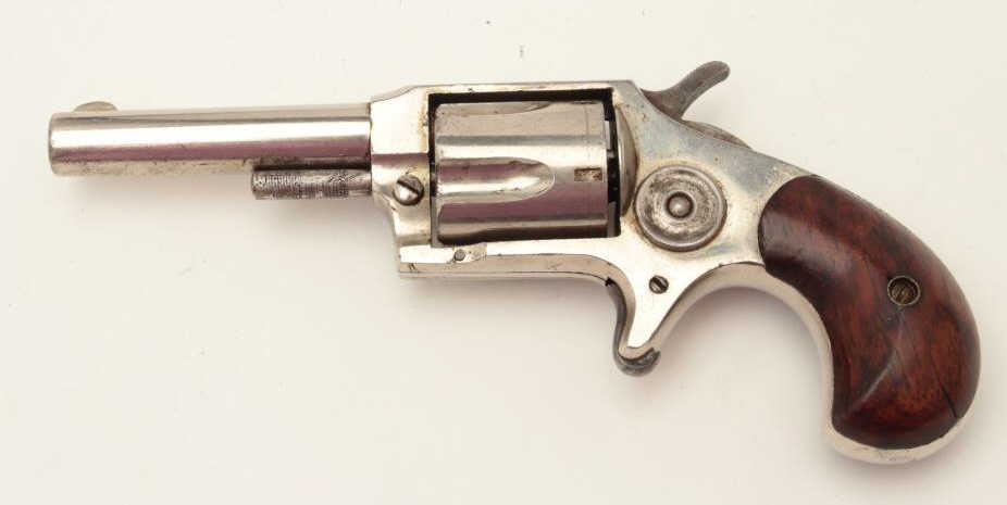 Red Jacket No. 6 spur trigger revolver, .30 caliber, 2.75” barrel, nickel finish, wood grips, S/N 28437, majority original nickel remaining, action not working, overall good grips with a small old crack at the bottom of the left grip. (Antique). Est.: $100-$200.
